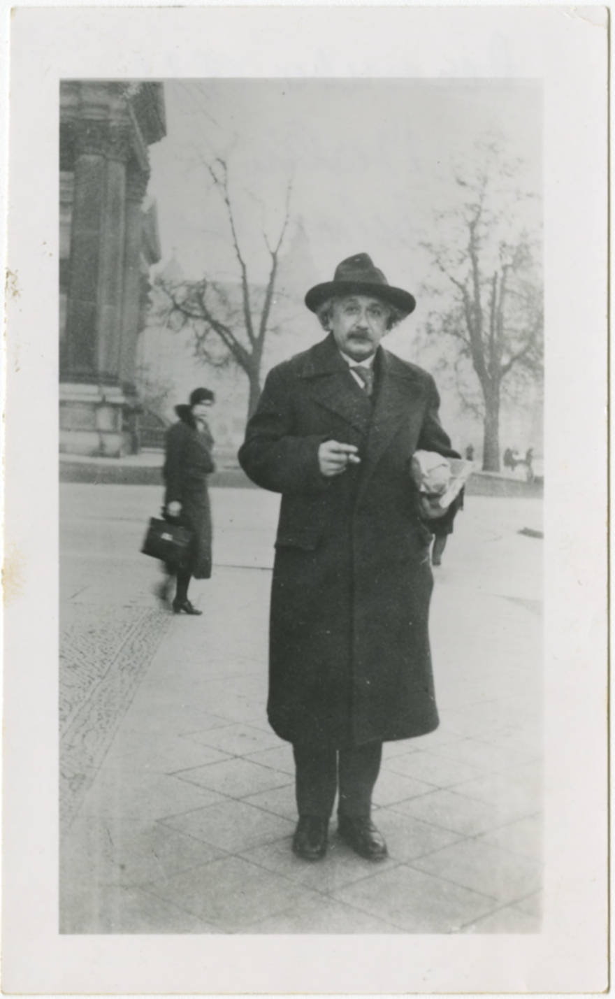 Albert Einstein standing on Unter den Linden, which is a main east-west thoroughfare in Berlin, Germany. The back of the photograph also notes that the picture was taken "before leaving for U.S.A."