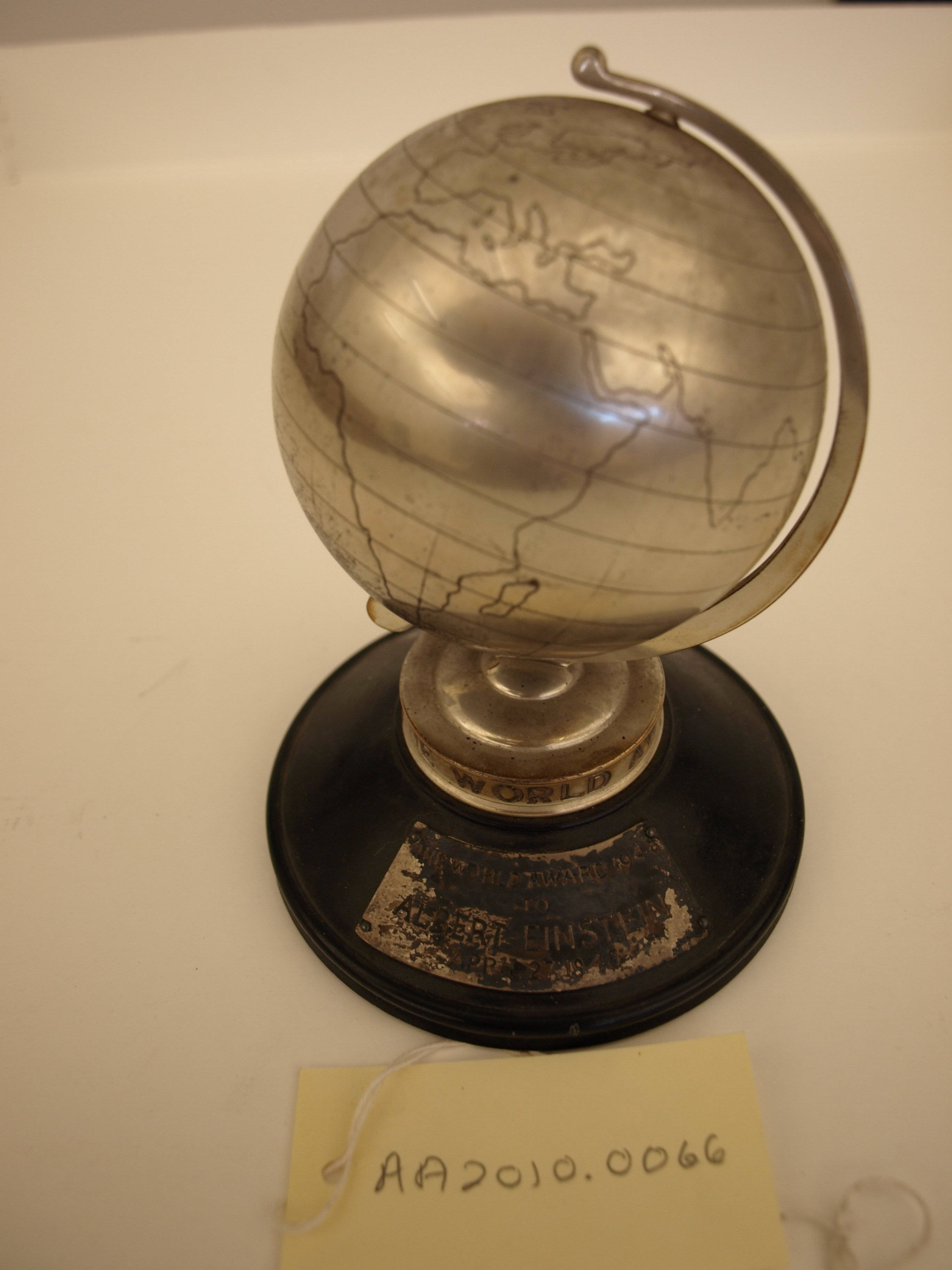 Silver globe presentation piece, which is engraved "One World Award Committee" around the diameter of the bottom edge of the silver. An engraved plate on wooden base of globe reads "One World Award 1948 to Albert Einstein. April 27, 1948".