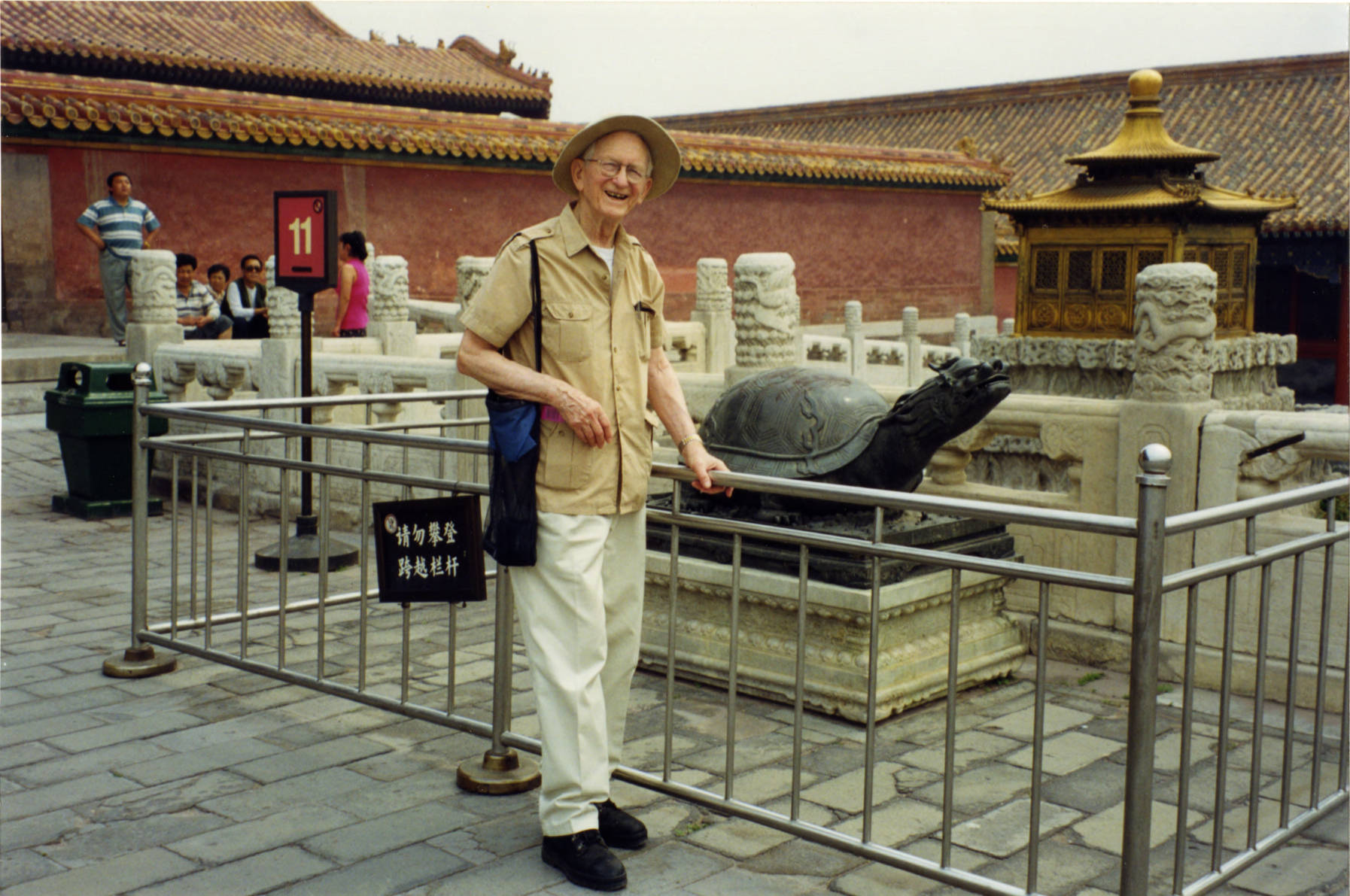 Atle Selberg standing next to a bronze tortoise at the Palace of Heavenly Purity in the Forbidden City in Beijing, China. One of a series of images taken during a 1998 trip by Selberg to China.