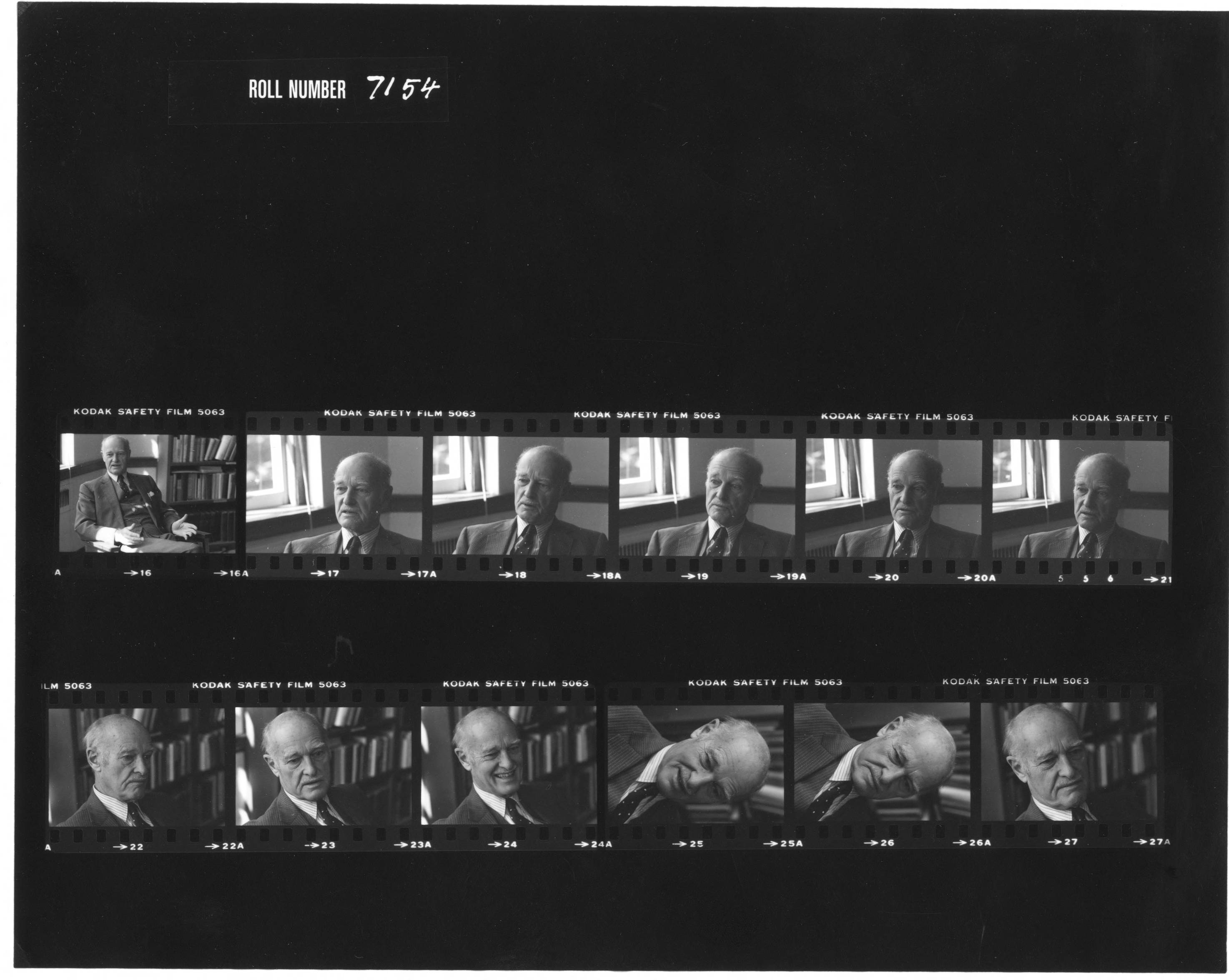 Contact sheet of images by Herman Landshoff from a formal portrait session of School of Historical Studies Faculty member George F. Kennan.