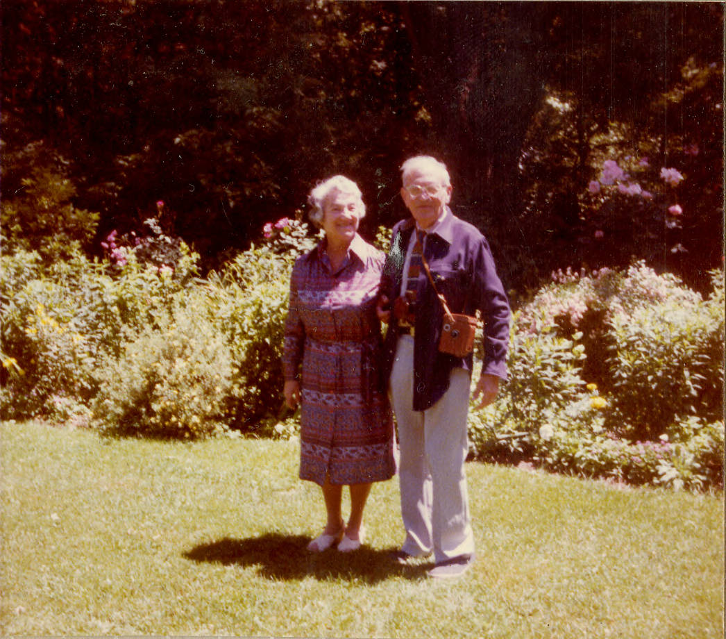Posing in the Morses' backyard are I.J. (Iso) Schoenberg and his second wife, Dolly (née van der Hoop). Schoenberg's first wife was also known as "Dolli," though her given name was Charlotte. She was the daughter of mathematician Edmund Landau.