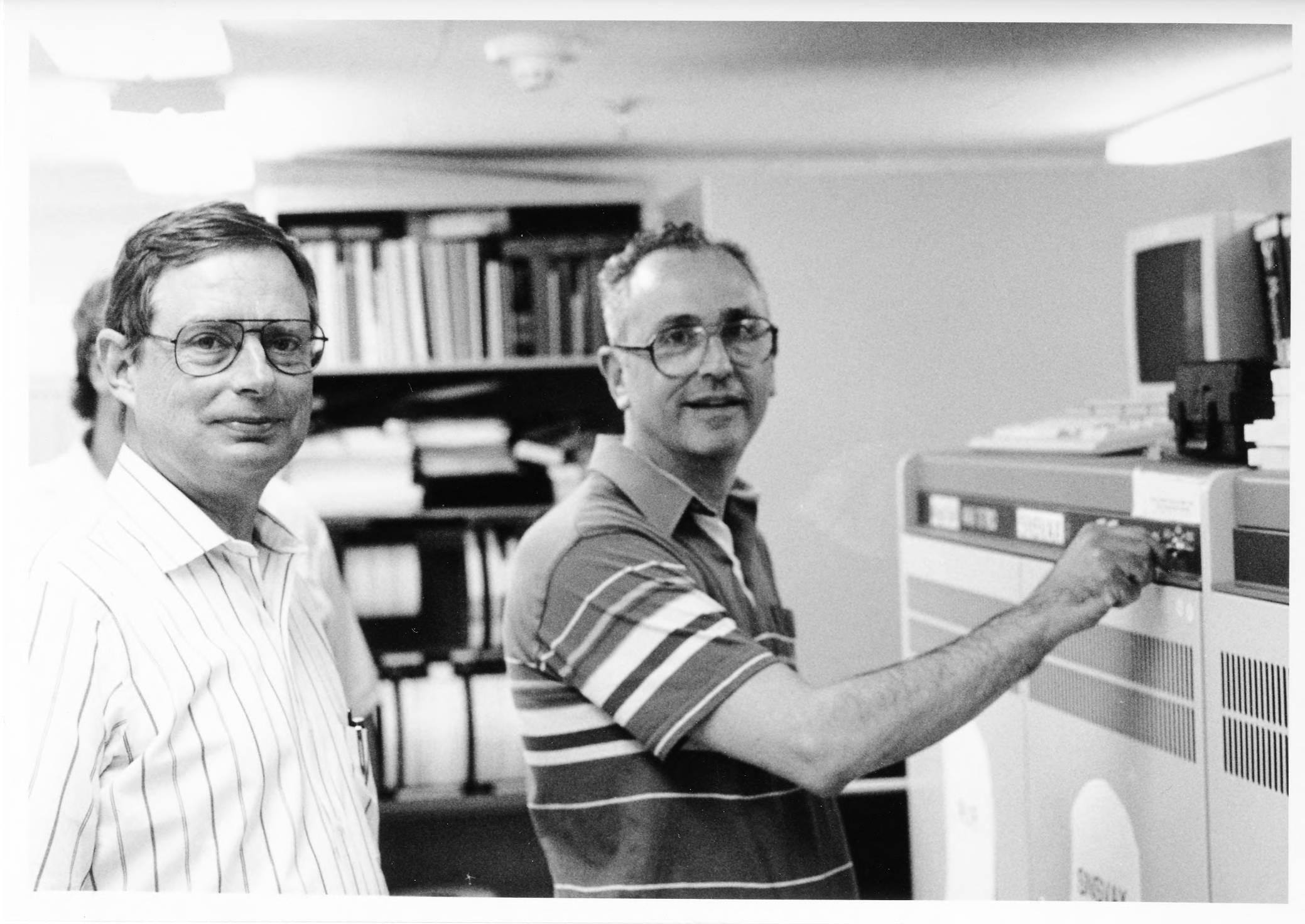 Photograph of John N. Bahcall (r.) and Phillip A. Griffiths appears to mark the occasion when the School of Natural Sciences shut down its VAX computer.