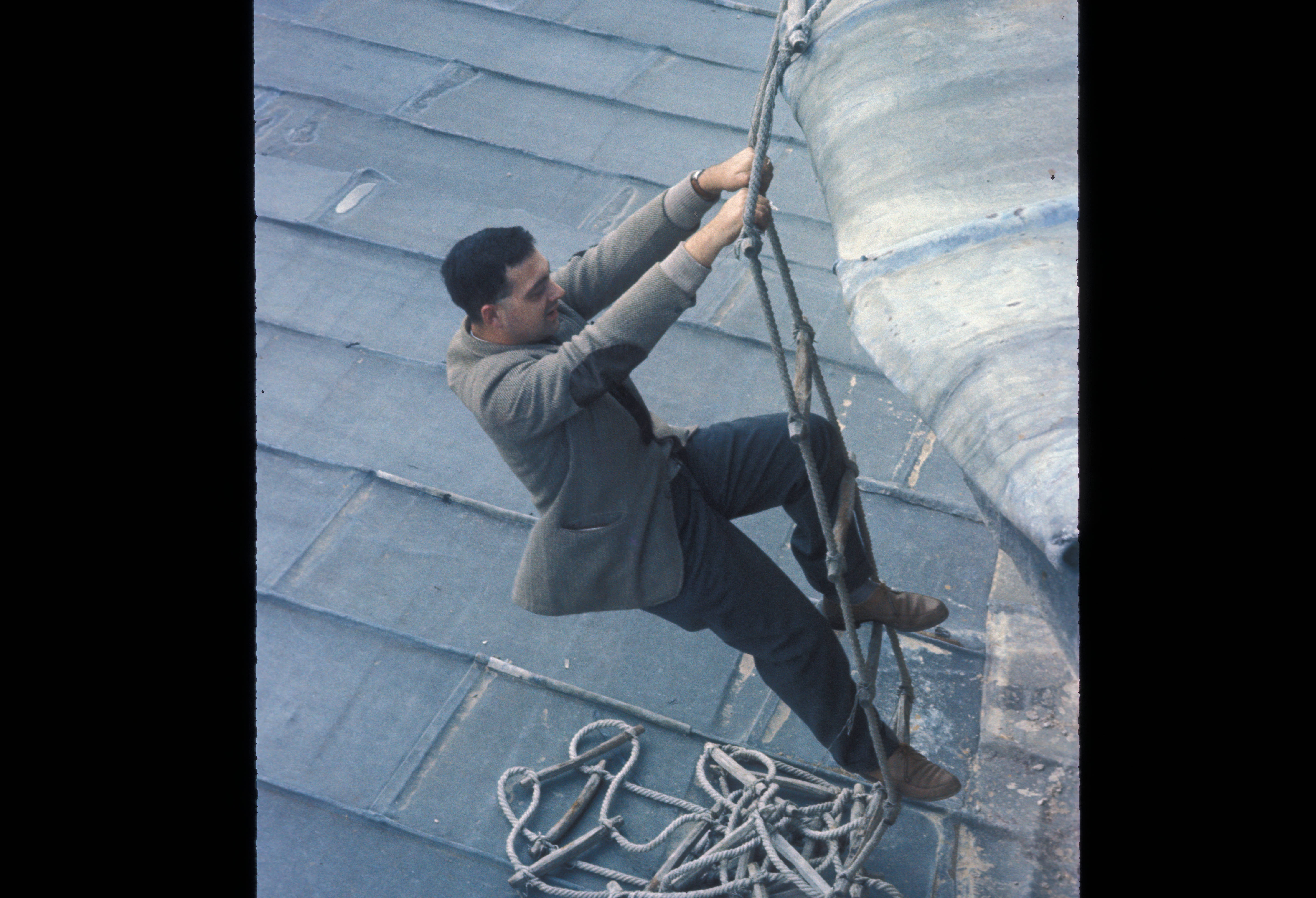 School of Historical Studies Faculty member Oleg Grabar climbs a rope ladder at an unidentified location