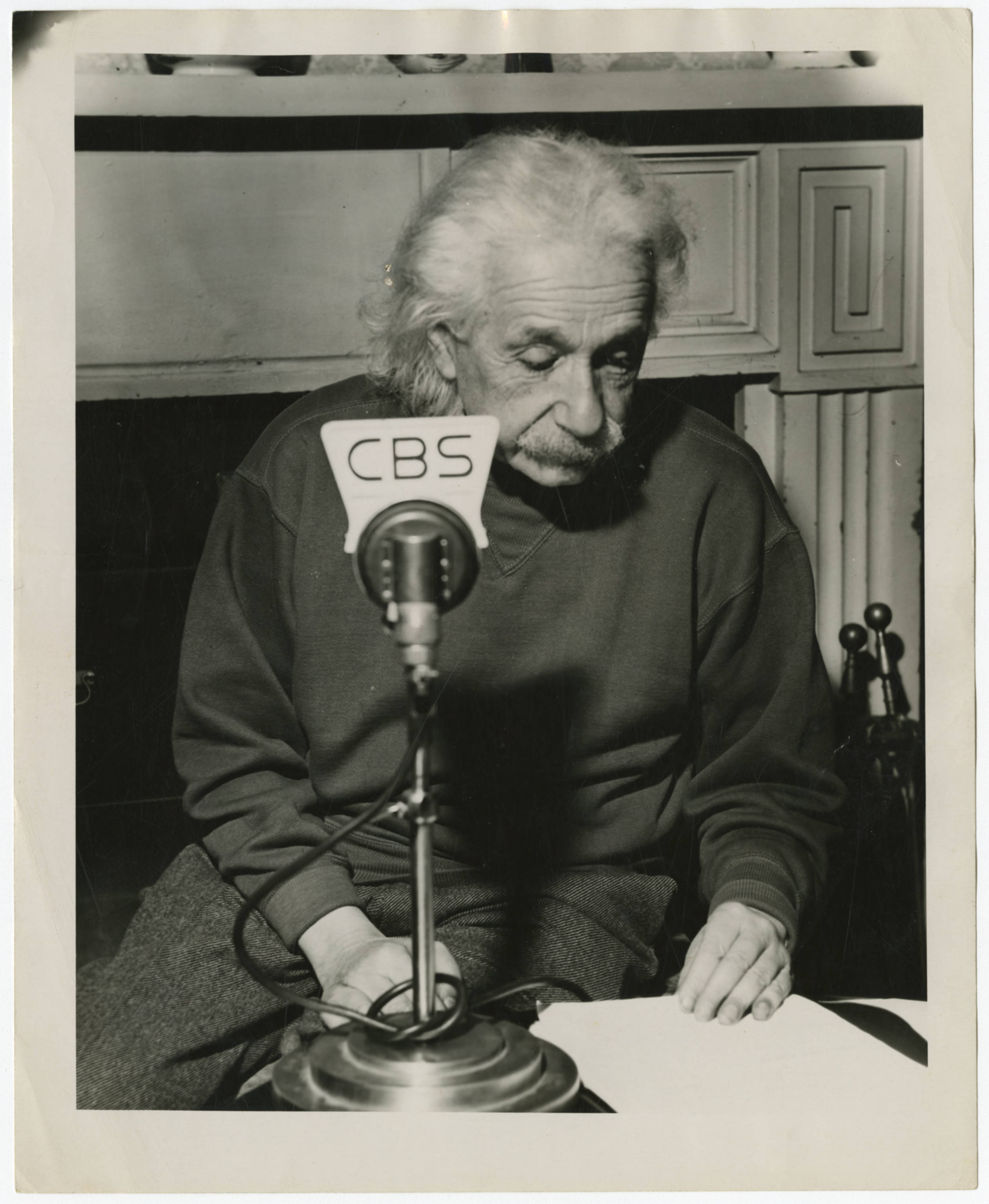Albert Einstein seated in front of a CBS microphone on an unidentified occasion.
