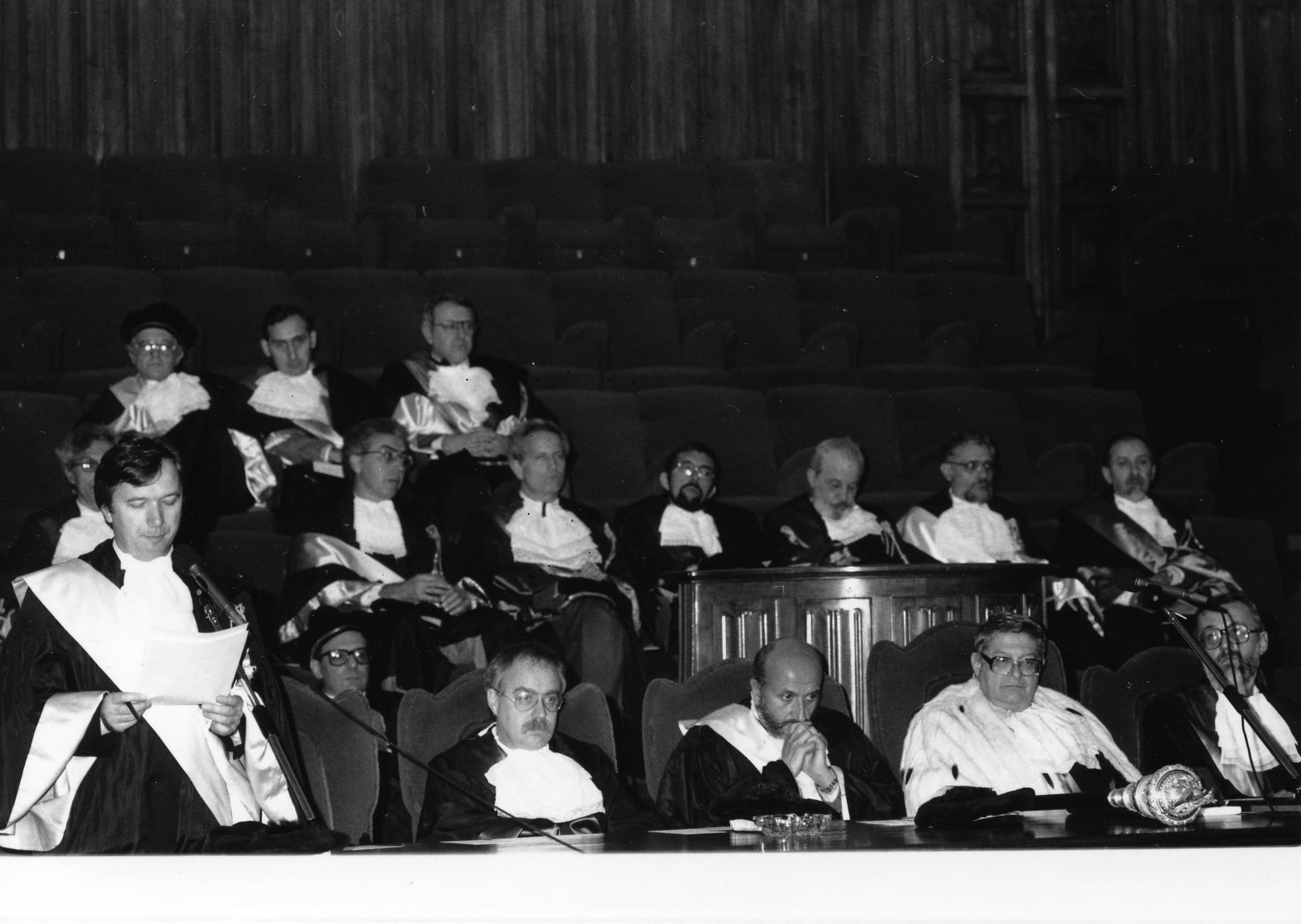 At the University of Turin in Italy, Franco Ferraresi speaking at the microphone on the occasion of the awarding of an honorary degree to Albert Hirschman, who was then a Professor of the School of Social Science, Institute for Advanced Study. Franco Ferraresi was a Member of the Institute's School of Social Science for the 1985-1986 academic year, and a Visitor to the School in 1991-1992. The other individuals in the photograph have not been identified.