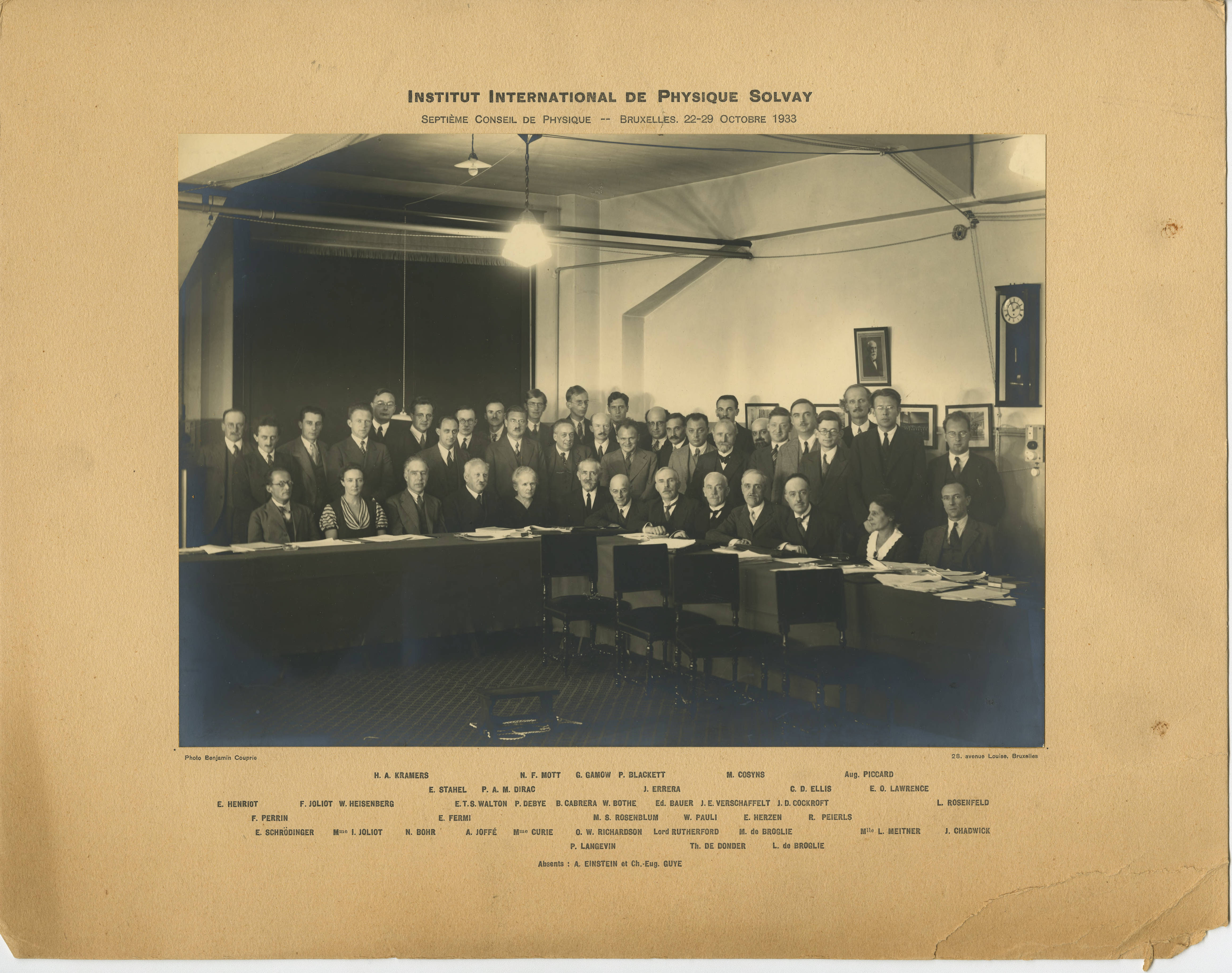 Group photograph of the scholars who attended the seventh Institut International de Physique Solvay, which was held in Brussels, Belgium, from October 22-29, 1933. Seated (left to right): Erwin Schrödinger, Irène Joliot-Curie, Niels Henrik David Bohr, Abram Ioffe, Marie Curie, Paul Langevin, Owen Willans Richardson, Lord Ernest Rutherford, Theophile de Donder, Maurice de Broglie, Louis de Broglie, Lise Meitner, James Chadwick. Standing (left to right): Émile Henriot, Francis Perrin, Frederic Joliot, Werner Heisenberg, Hendrik Anthony Kramers, Ernst Stahel, Enrico Fermi, Ernest Thomas Sinton Walton, Paul Dirac, Peter Joseph William Debye, Nevill Francis Mott, Blas Cabrera, George Gamow, Walther Bothe, Patrick Blackett, M.S. Rosenblum, Jacques Errera, Ed. Bauer, Wolfgang Pauli, Jules-Émile Verschaffelt, M. Cosyns, Edouard Herzen, John Douglas Cockcroft, Charles Drummond Ellis, Rudolf Peierls, Auguste Piccard, Ernest O. Lawrence, Leon Rosenfeld.