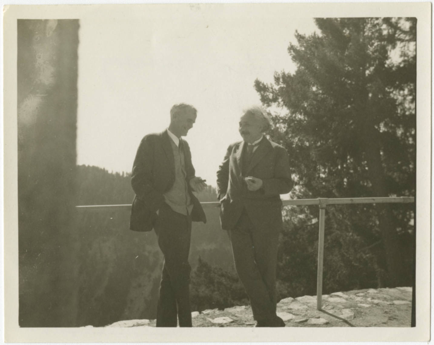 Albert Einstein and Observatory Director Walter S. Adams standing outside at the Mt. Wilson Observatory in California.