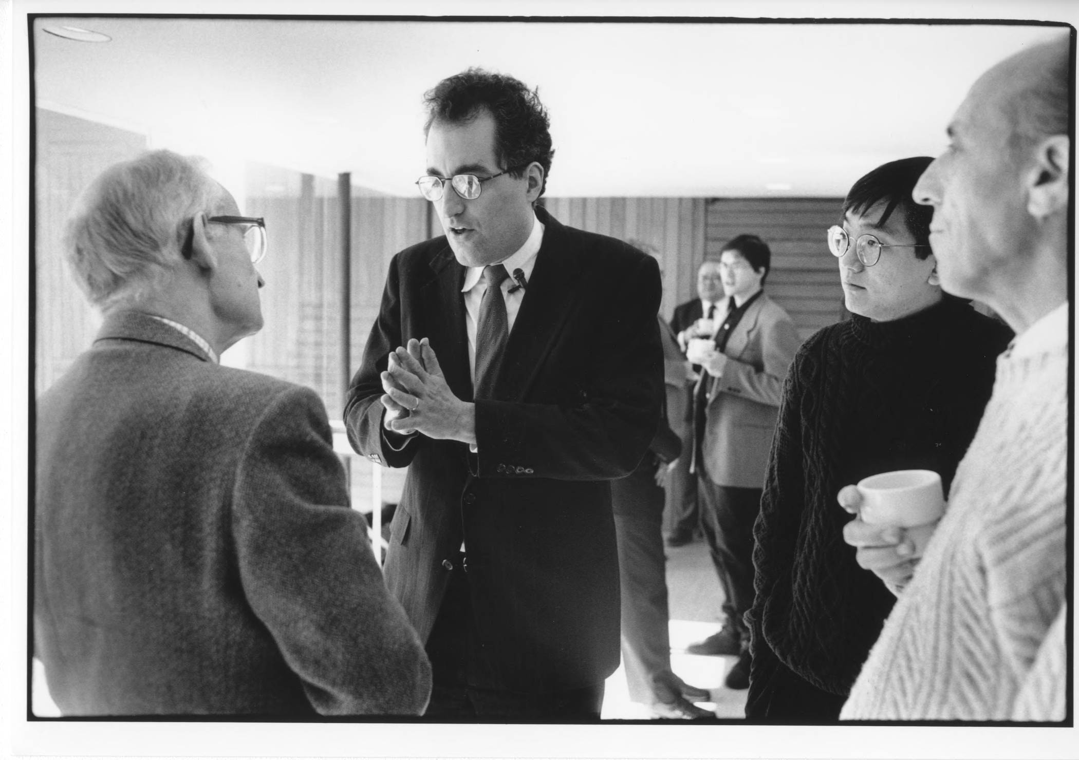 Engaged in conversation outside the White-Levy Room on the Institute campus where he was making a presentation are School of Natural Sciences Faculty member Edward Witten (second from left) and unidentified individuals attending the talk.