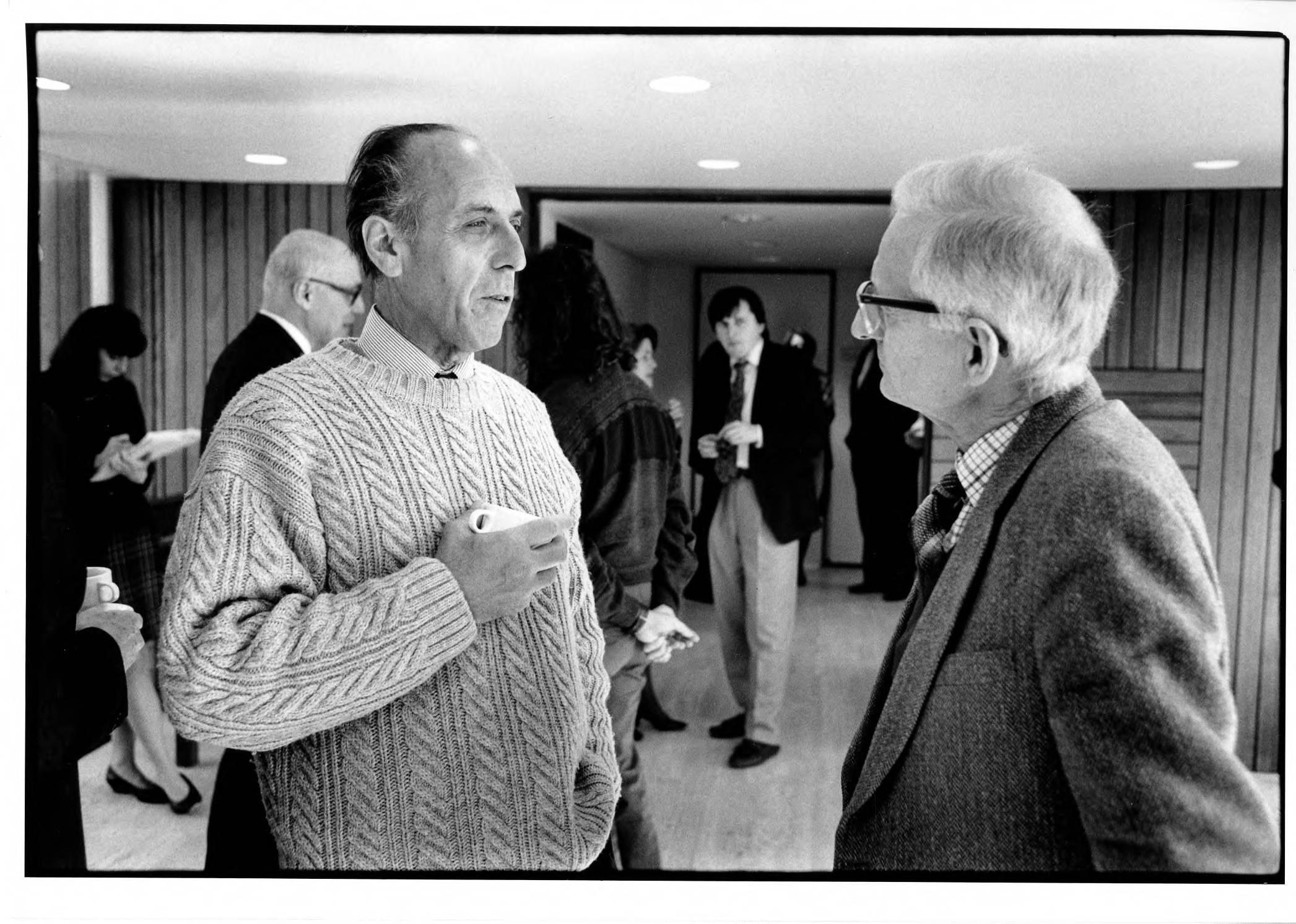 Unidentified attendees to a lecture given by Edward Witten talk during a break