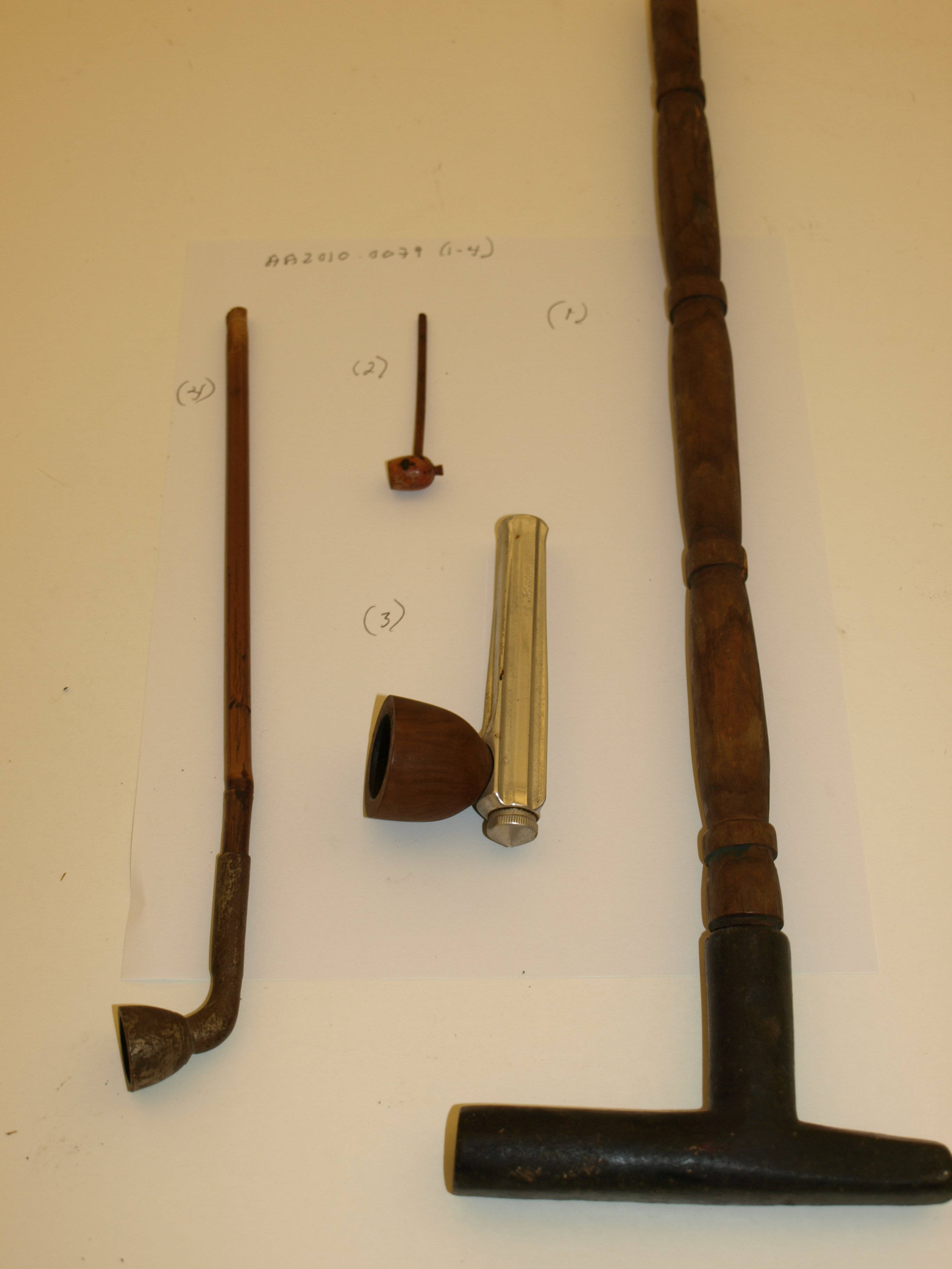 A group of four unusual pipes: 1.) carved wooden stem and black stone bowl (48.5 cm. in length), 2.) miniature wooden pipe (7.5 cm. in length), 3.) silver-colored metal pipe stem with carved wooden bowl and "Kirsten" stamped on the stem (11 cm. in length), and 4.) wood or bamboo stem with brass bowl (27 cm. in length).
