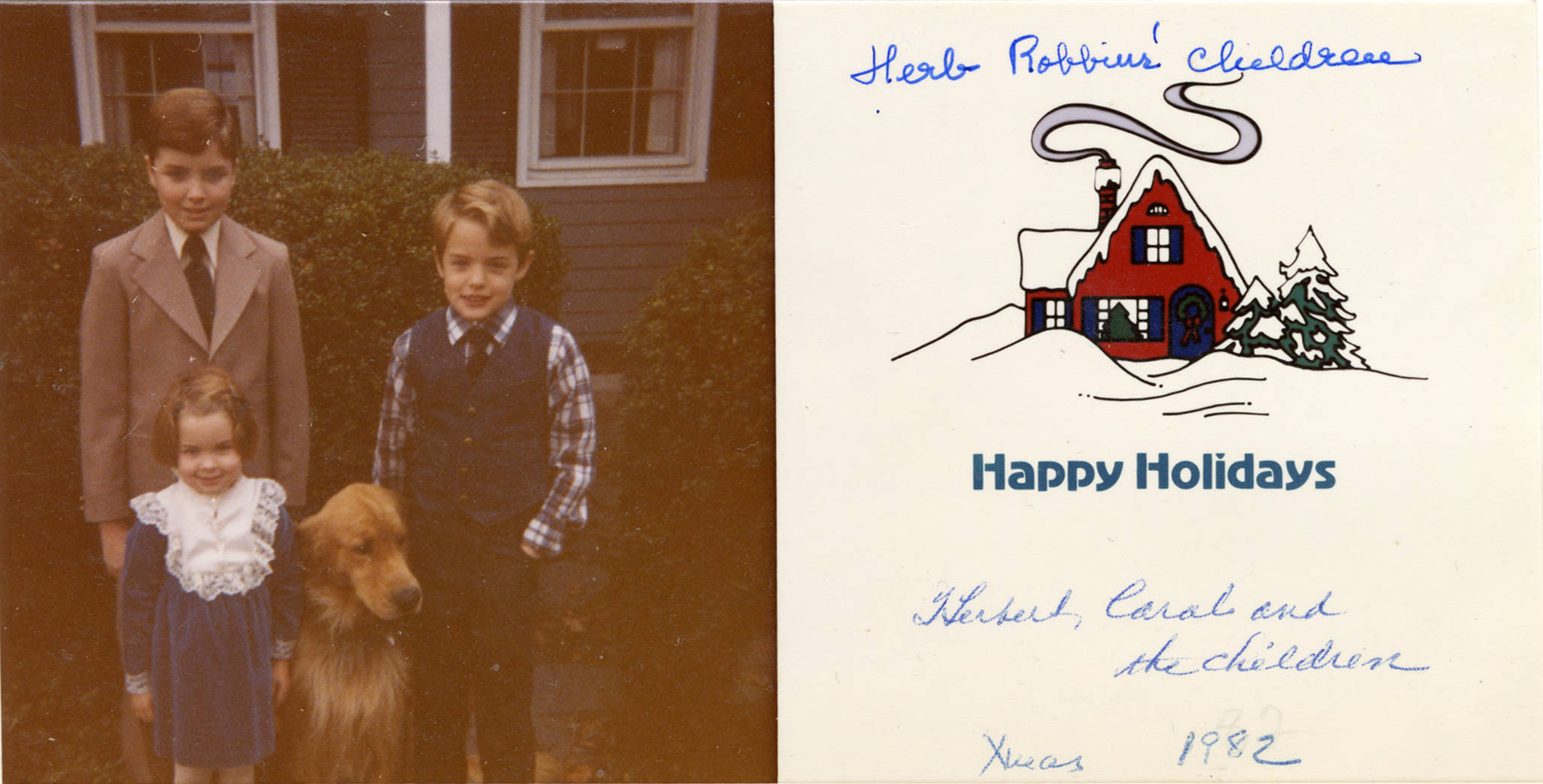 Holiday greeting card sent to Louise Morse featuring a photograph of the children and family dog of Carol and Herbert Ellis Robbins.