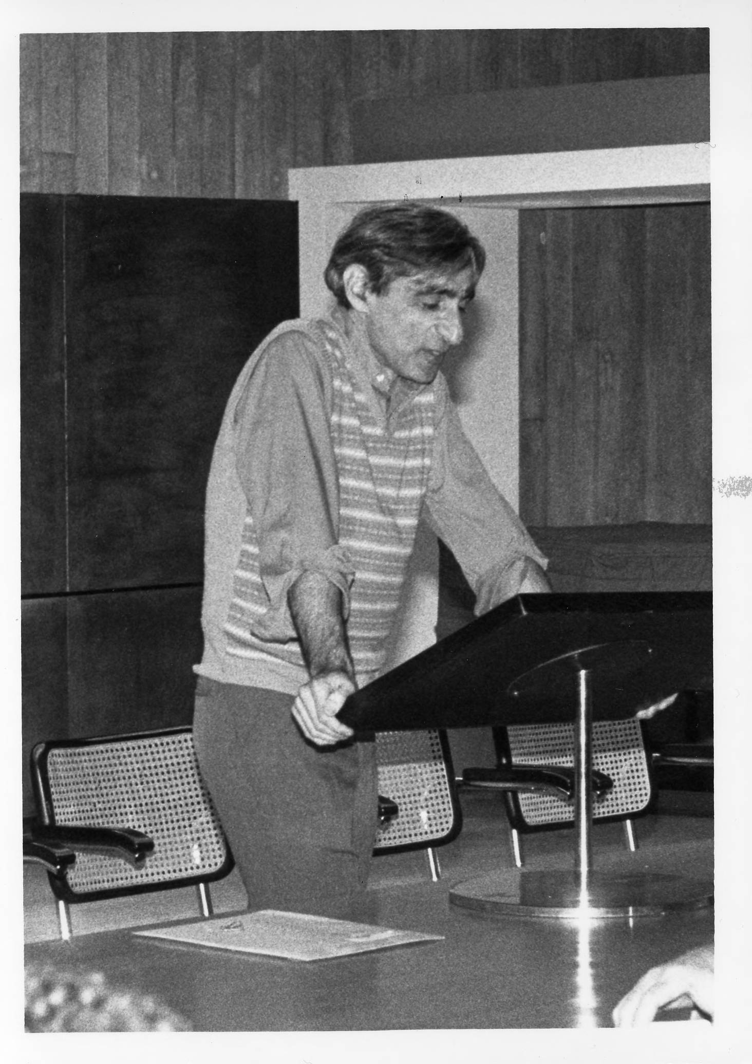 Informal portrait of School of Social Science Faculty member Michael Walzer presenting a talk at the Institute for Advanced Study.