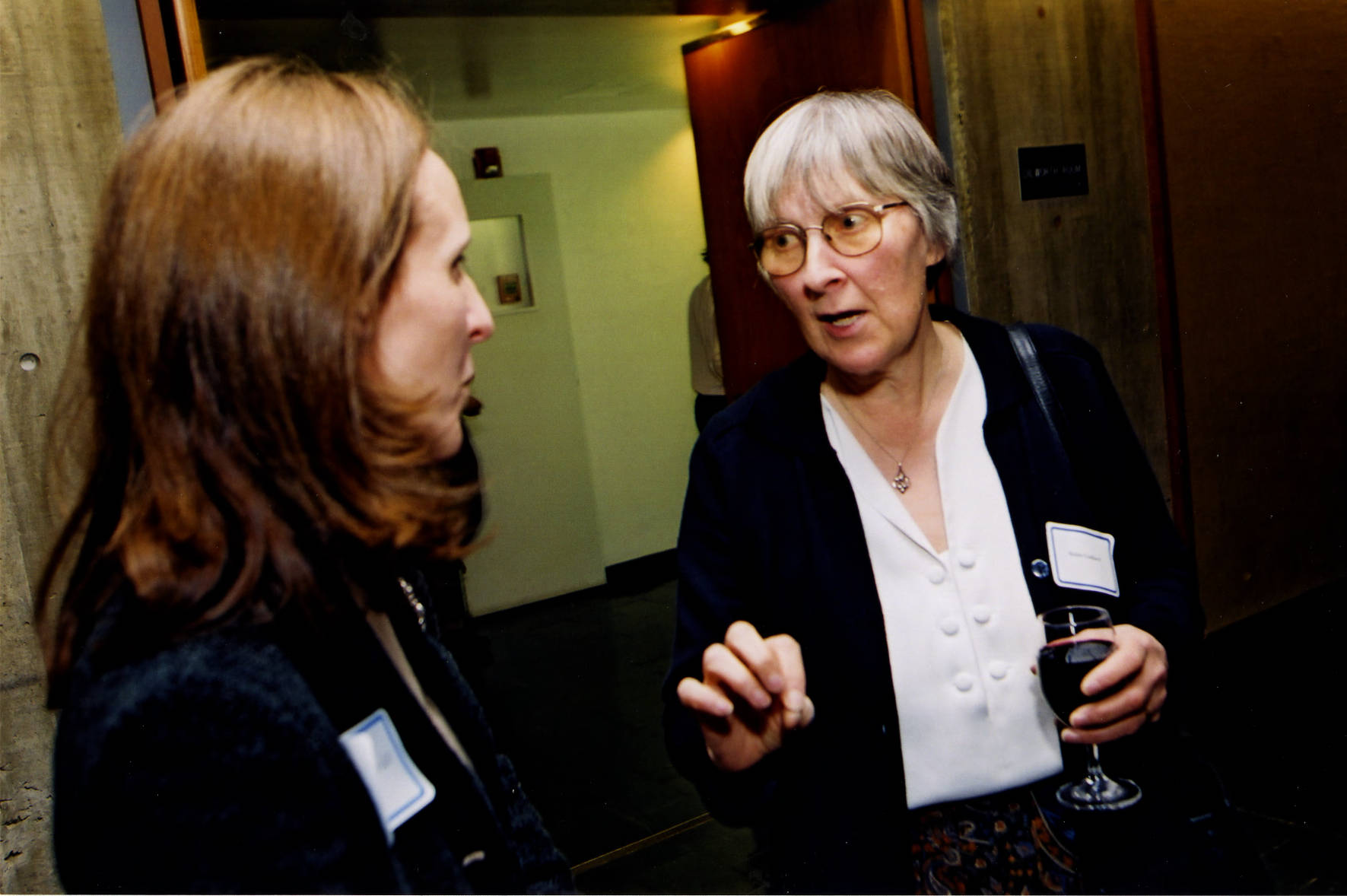 Attending the spring term reception to welcome newly arriving Members and Visitors in Marilyn and James Simons Hall on the Institute campus are Helen Goddard (r.) with an unidentified guest.