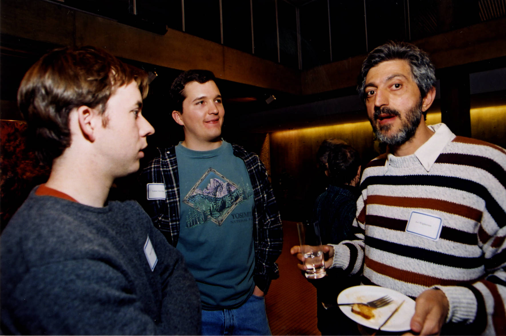 From right to left, School of Mathematics (SM) Faculty member Avi Wigderson with SM Members Nathan Segerlind and Ryan William O'Donnell at the spring term reception to welcome newly arriving Members and Visitors in Marilyn and James Simons Hall on the Institute campus.
