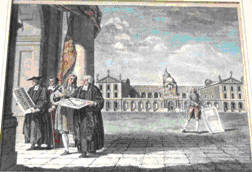 The Queens College, with architects plans. Appeared in the Oxford Almanack of 1762. On the left Sir Joseph Williamson and Dr. Lancaster consult about a plan for rebuilding the Queens College. Bishop Barlow and Dr. Halton are beside them and they are looking at the elevation of the library. John Michel on the right points to the spot on which his building was erected. This commemorates the completion of the front quadrangle of the college and the individuals responsible for it.