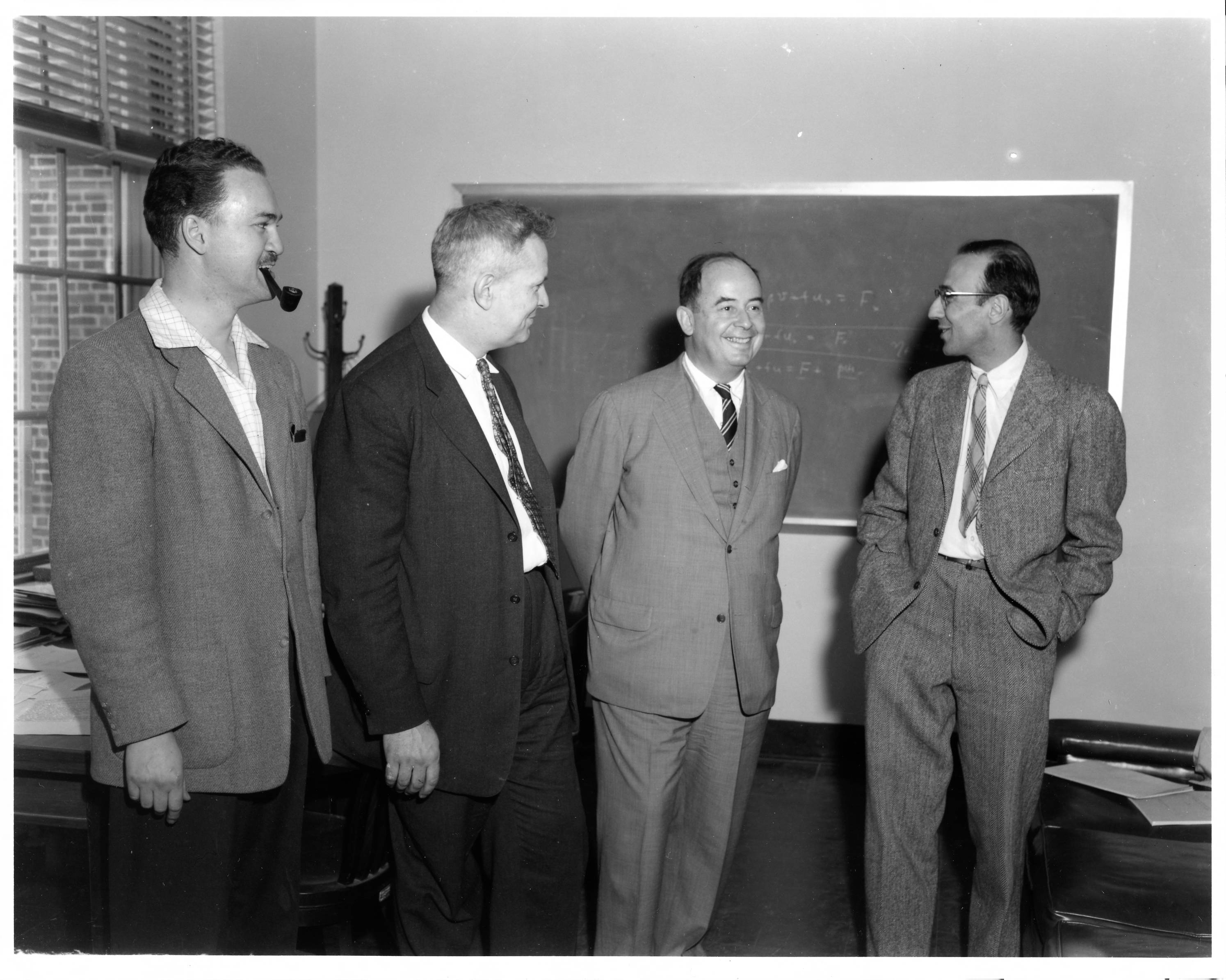 James Pomerene, Julian Bigelow, John von Neumann and Herman Goldstine standing in front of a blackboard in a classroom.