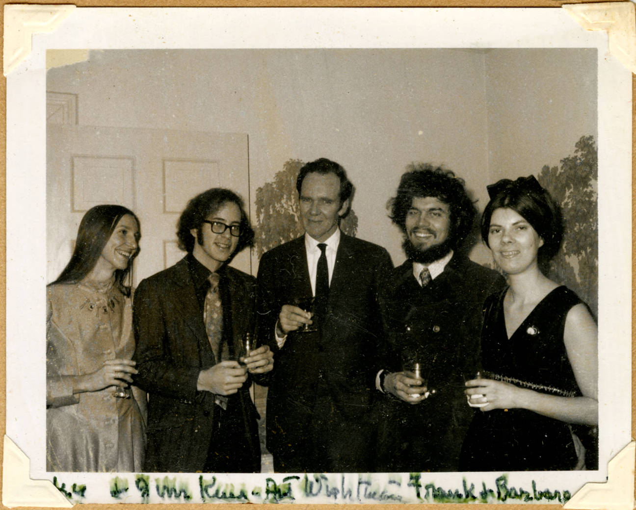 Attending a social gathering of the School of Mathematics at the home of Louise and Marston Morse are (l. to r.): Vicky and James R. King, Arthur Strong Wightman, and Barbara and Frank S. Quinn, III.