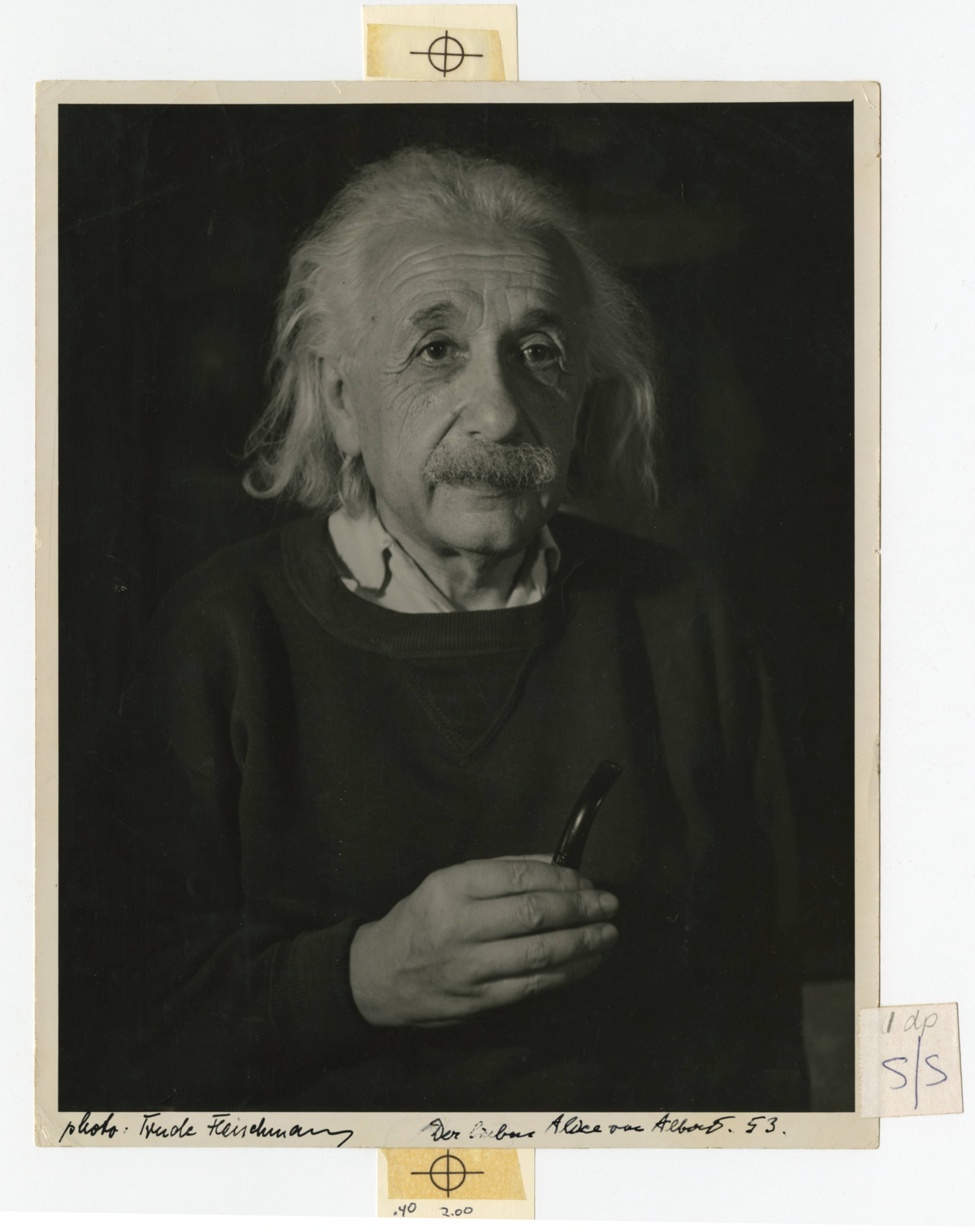 This portrait of Albert Einstein was presented inside a paperboard portfolio frame. Both the back of the print and the portfolio are stamped: "This credit line will be appreciated: Trude Fleischmann, 127 West 56th Street, New York City." The portfolio interior is signed in pencil by the photographer on the lower left of the paperboard, and the photograph itself is dated and inscribed in German (across the white margin at the bottom of the print) to Einstein by the photographer. The text is not completely legible.