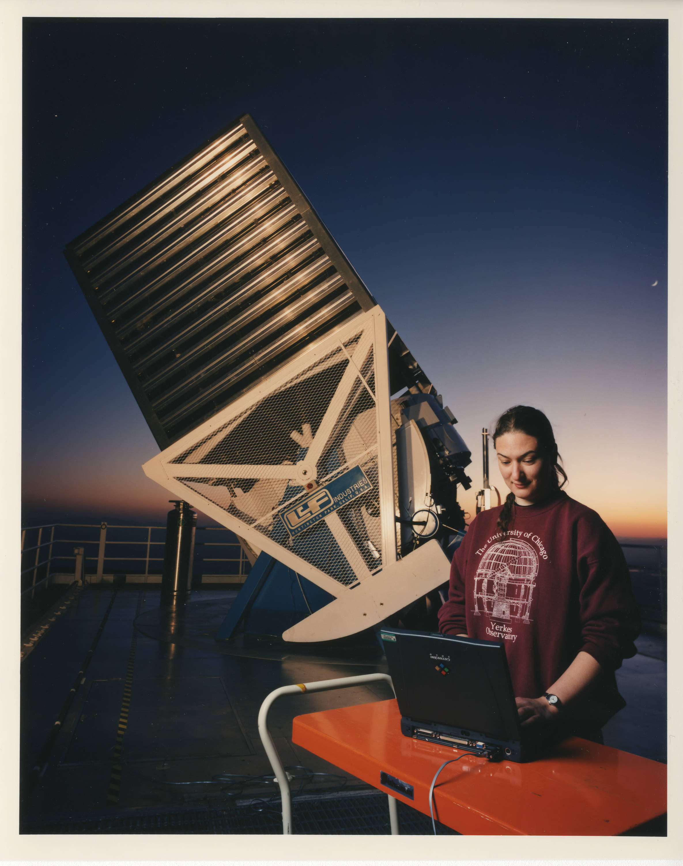 The Institute for Advanced Study was one of the institutional sponsors of the Sloan Digital Sky Survey. Per the caption of the back of this print, "Constance Rockosi, a graduate student at the University of Chicago and a member of the multi-institutional team that built the scanning camera for the Sloan Digital Sky Survey, checks the status of the instrument during its first on-the-sky trial runs in May 1998."