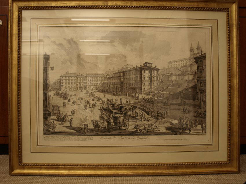 "Veduta di Piazza di Spagna" etching from the 18th c. "Veduta di Roma" (1753-1760); city view of a busy street with a fountain and carriages in the foreground and the Spanish Steps and buildings in the background, groups of people and individuals throughout the scene.