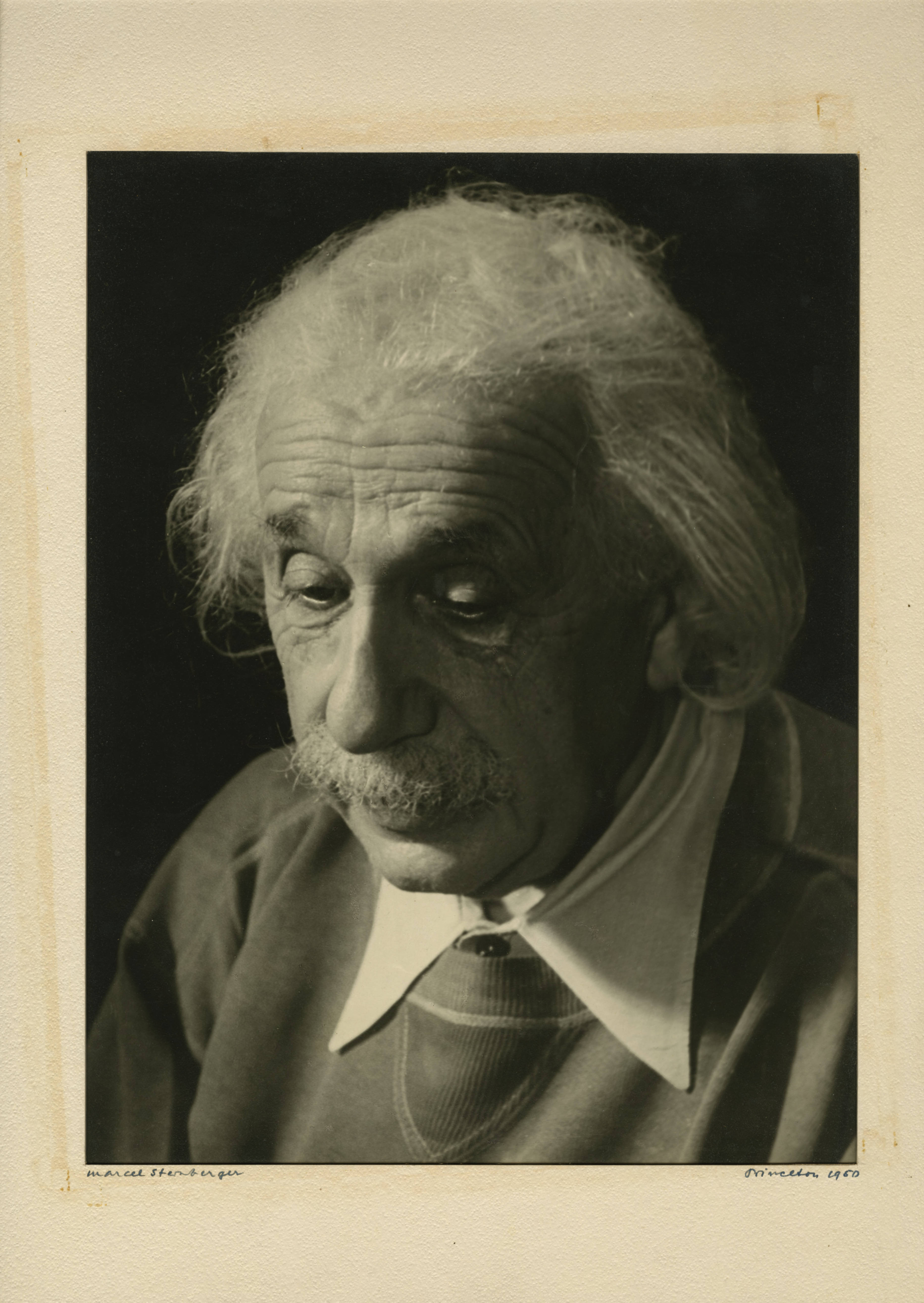 Formal portrait of Albert Einstein taken in Princeton, New Jersey. The print is taped to a heavyweight mat board frame, which is signed in the lower left corner by the photographer. Also, see EB 197, EB 210, and EB 231 by the same photographer. Of these, only EB 197 is also of Einstein.