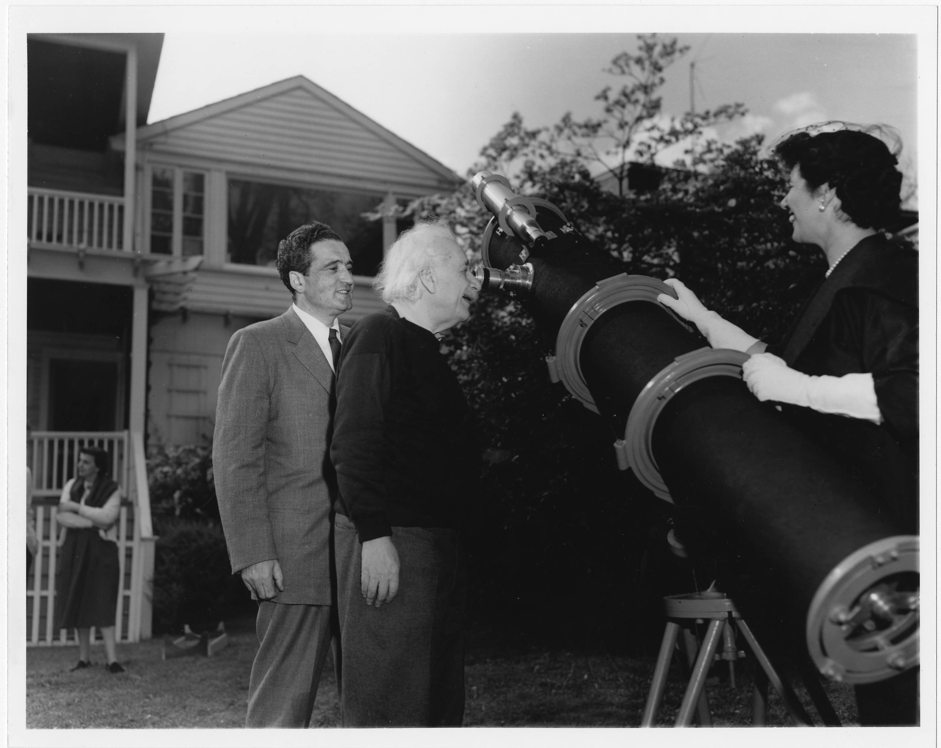 In the backyard of his home (112 Mercer Street, Princeton, New Jersey), Albert Einstein looks through a telescope while Zvi Gezari and an unidentified woman look on. Helen Dukas is in the background.