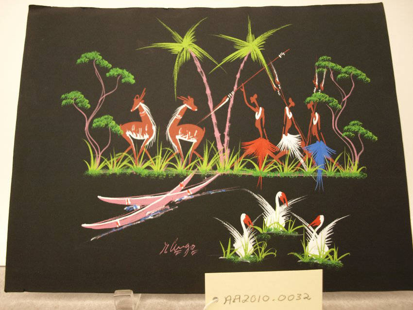 Painting on black paper of African scene. Three hunters with spears are approaching two deer (antelope?) Two pink boats are in foreground along with three red and white birds .Four trees and tall grass. Highly stylized. Signed in pink paint "R Argo"