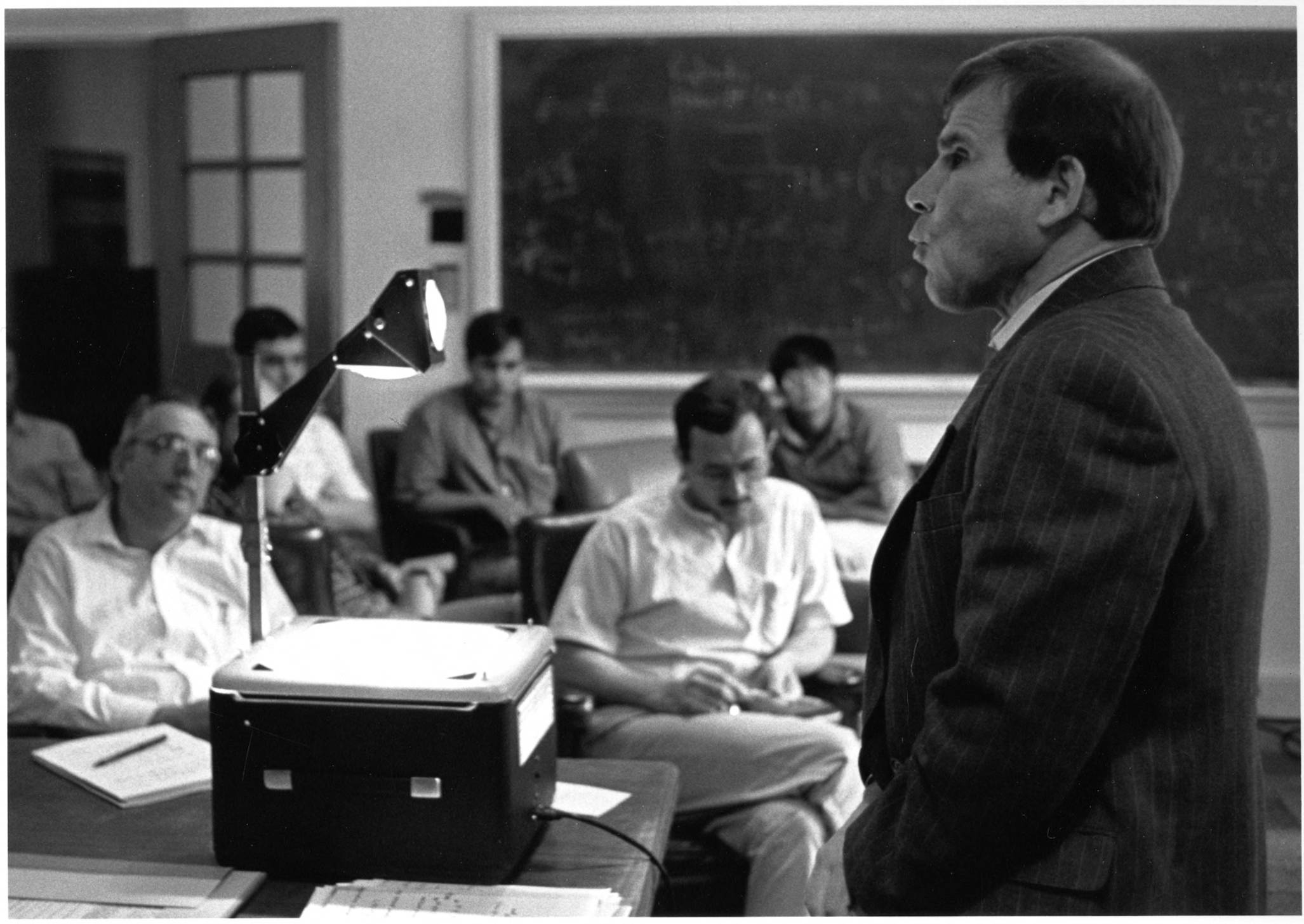 Nuclear physicist Vladimir Gavrin presenting a lecture to an audience, including John Bahcall (left of projector), at the Institute for Advanced Study. This photograph was one of the images on display in Professor Bahcall's office on the Institute for Advanced Study campus.
