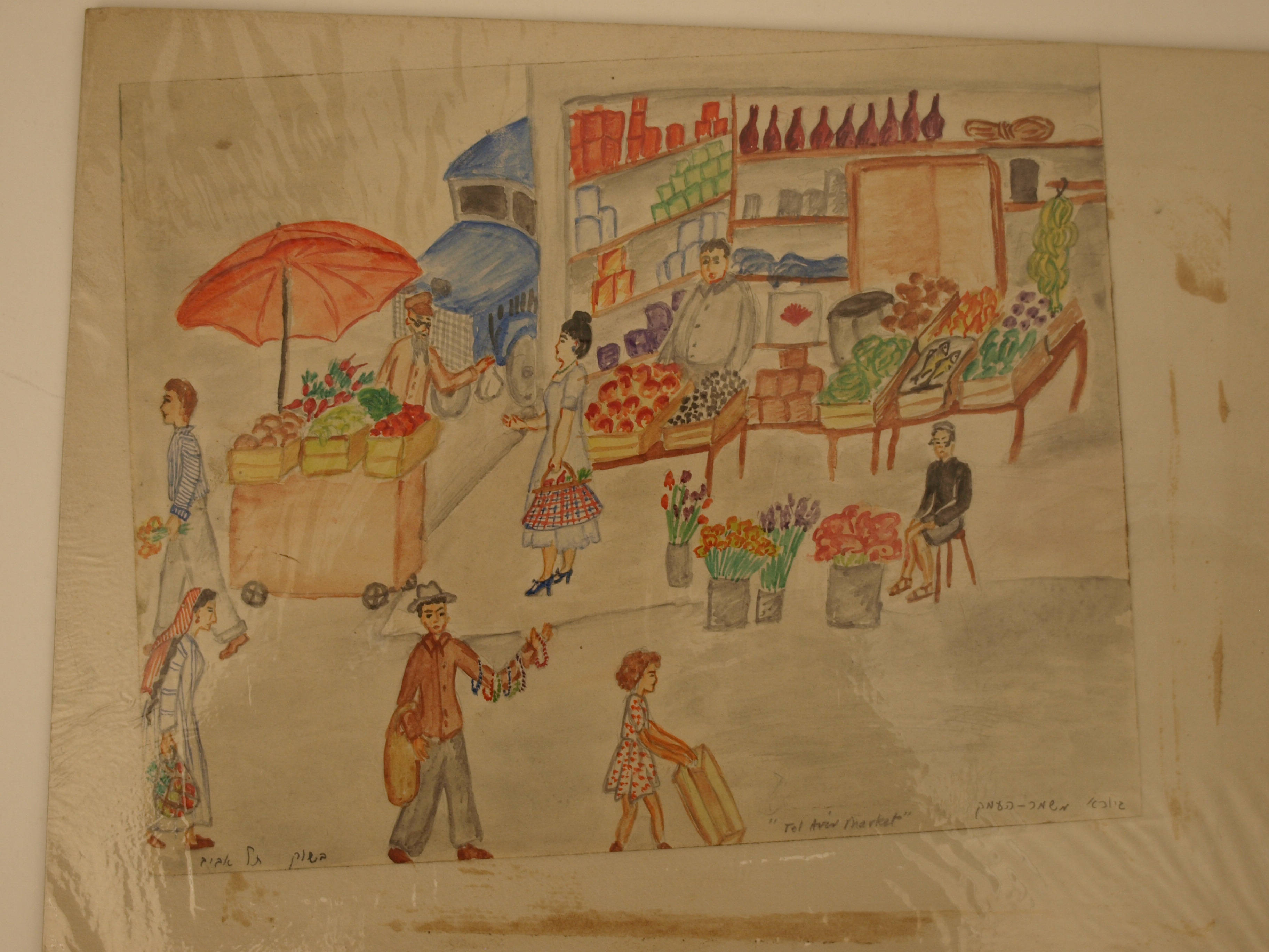 Childlike colorful watercolor and ink painting of a "Tel Aviv Market"; people walking and vendors selling fruits, vegatables, flowers; blue truck behind stall in background; inscriptions along the lower edge are not decipherable (Hebrew? on the reverse of the backboard is stamped: "Children to Palestine, 1019 Broadway, New York 23, New York" and in pencil "#9".