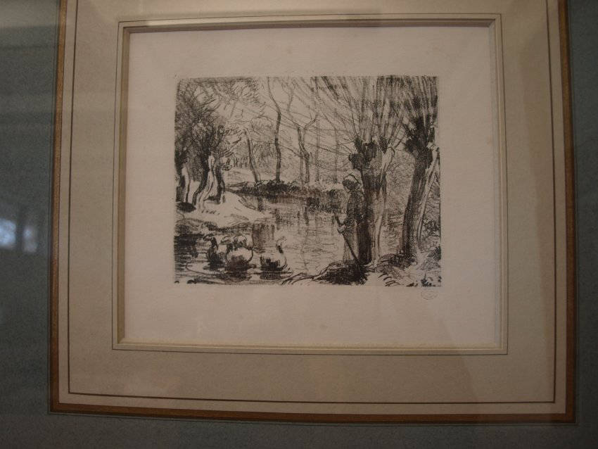 Hand written label on reverse: "Pissarro (Camille) Gardeuse d'oies, Lithographie originale v. 1898, Tirage posthume v. 1904-05,.50 epreuves"; black and white print of swans? on a river with a figure watching them in the foreground, and trees in the background.