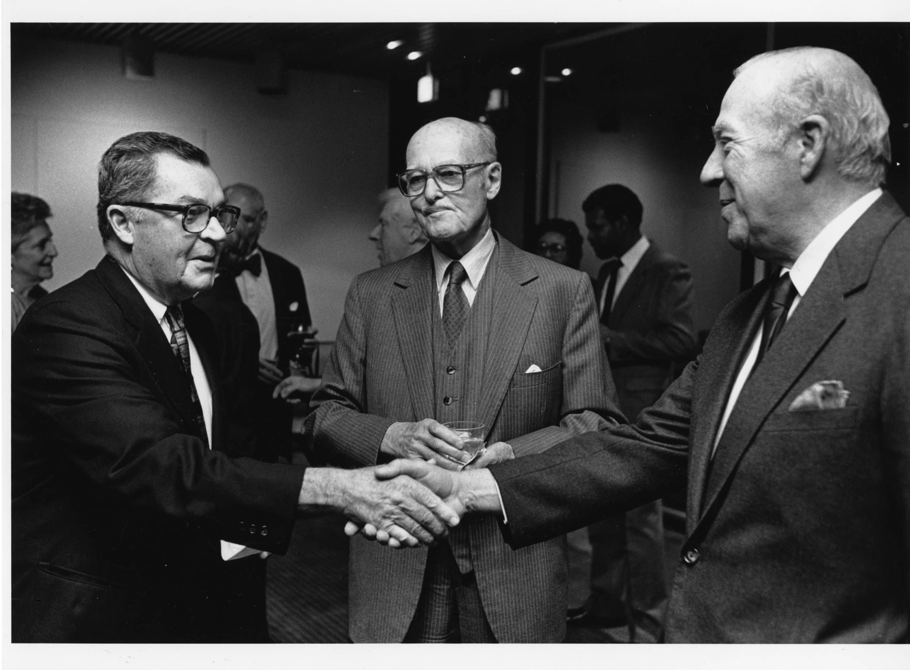 George Kennan looks on as George Shultz and former Princeton University President Robert Goheen shake hands at a dinner for the Friends of the Institute for Advanced Study.