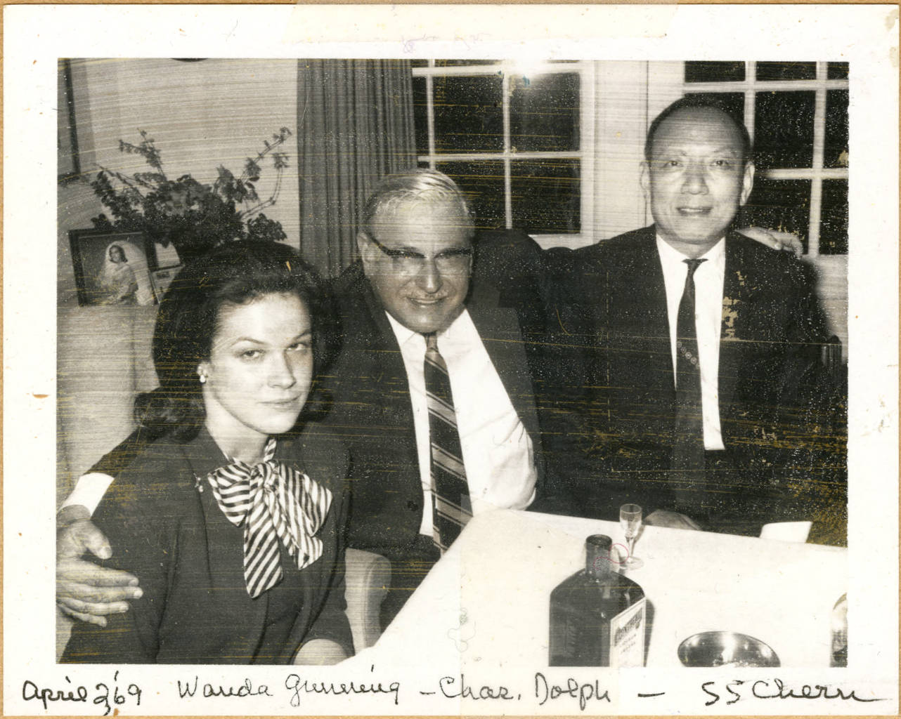 After a symposium honoring Salomon Bochner, (l. to r.) Wanda Gunning, Charles Dolph, and Shiing-Shen Chern dine at the home of Louise and Marston Morse.
