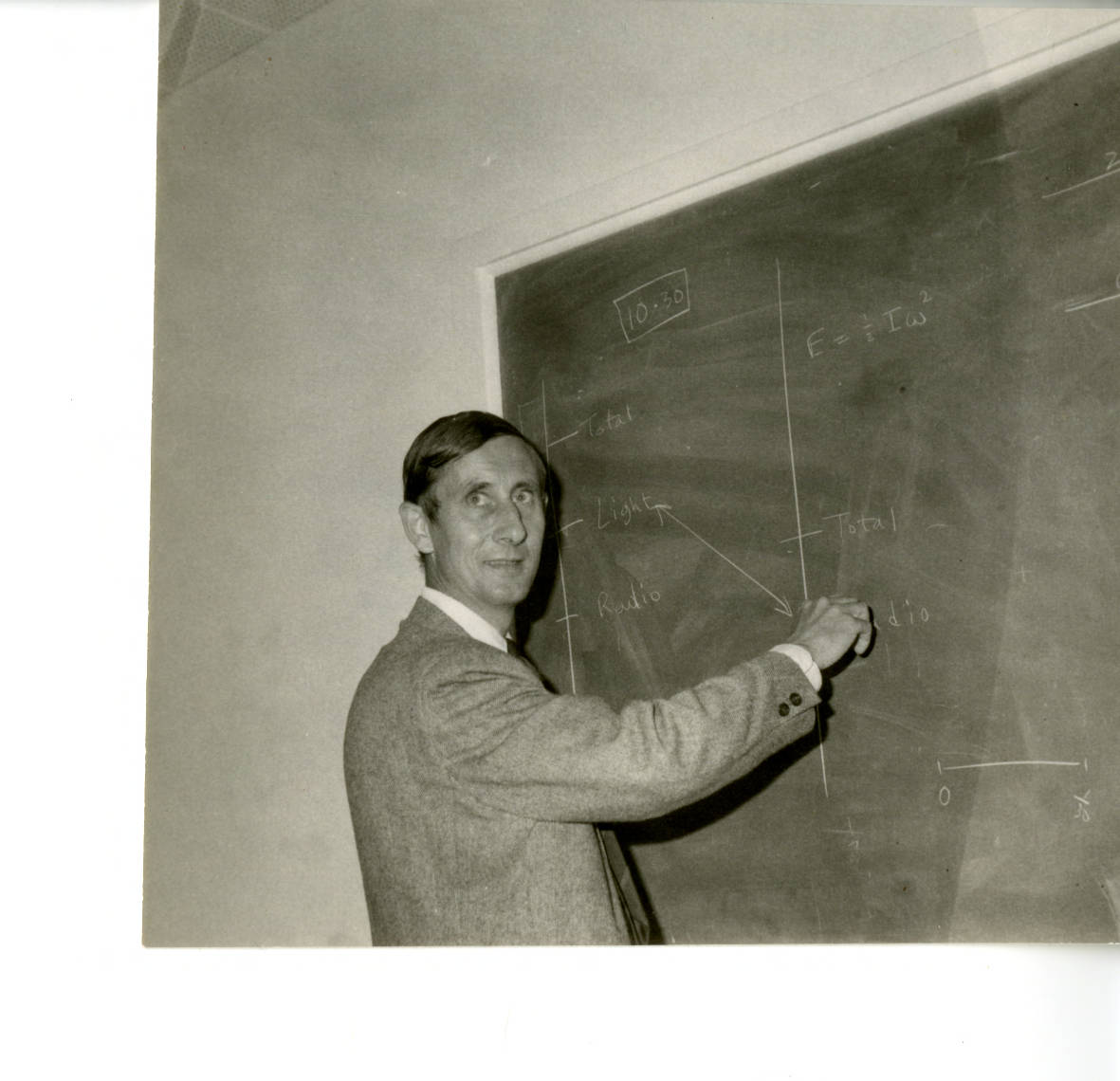 School of Natural Sciences Faculty member Freeman Dyson stands in front of a blackboard.