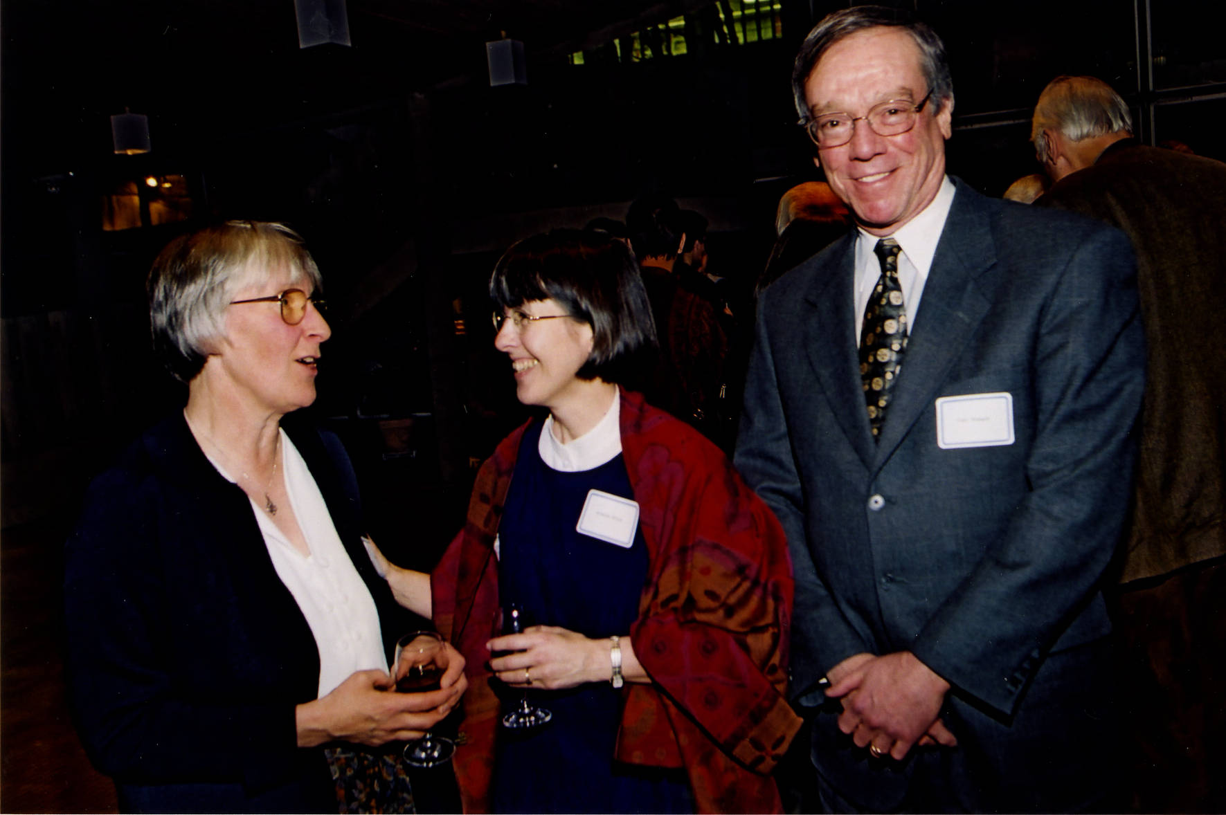 Attending the spring term reception to welcome newly arriving Members and Visitors in Marilyn and James Simons Hall on the Institute campus are (l. to r.) Helen Goddard, IAS Major Gifts Officer Kamala Brush, and an unidentified guest.