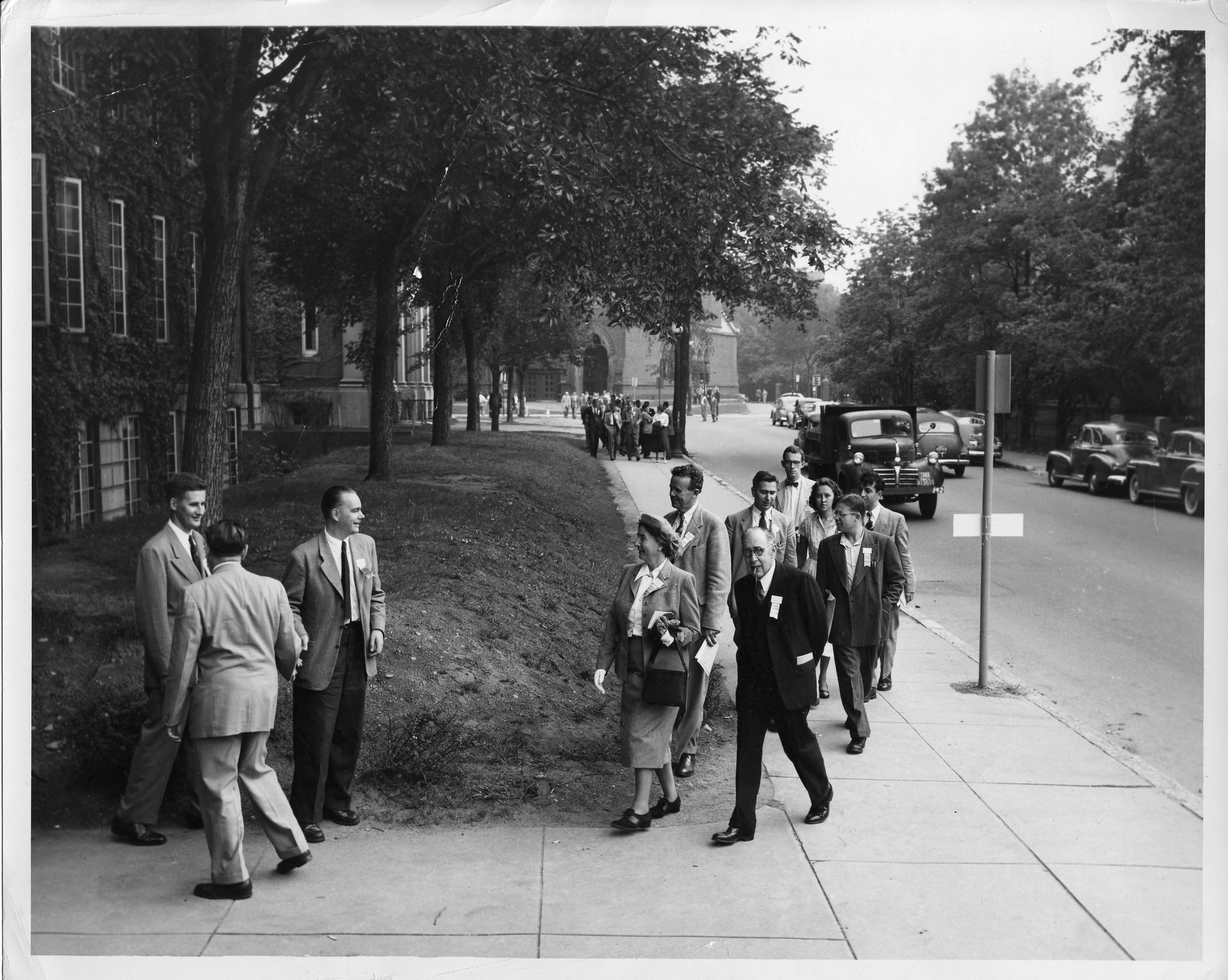 Niels Bohr, who was a Member of the School of Mathematics multiple times in the 1930s-1950s, and his wife are among a group walking on the campus of Princeton University.