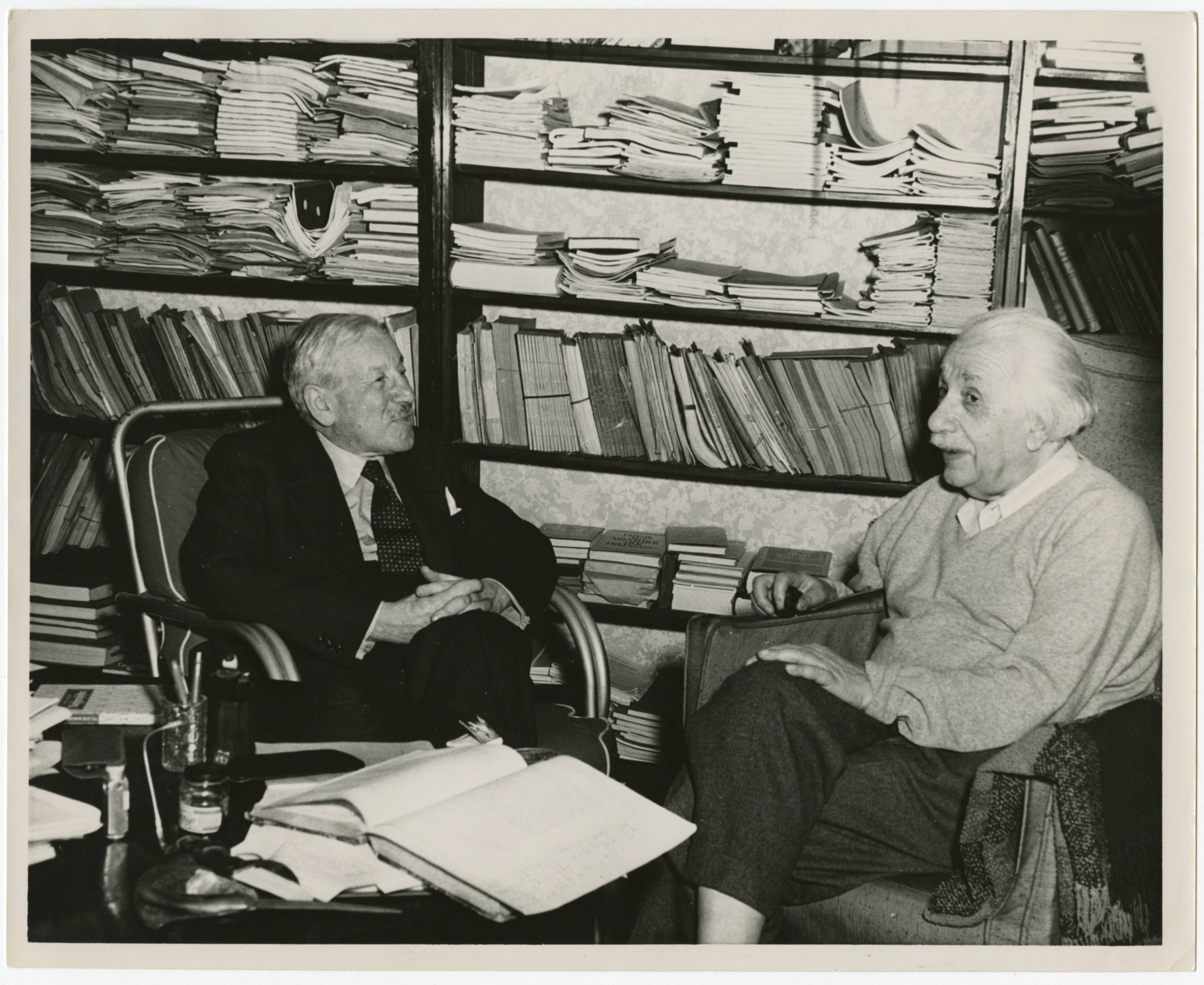 Seated in the study of his house at 112 Mercer Street, Princeton, New Jersey, are Albert Einstein and Herbert Louis Samuel (left). There are other images in the collection that appear to have been taken on the same occasion that suggest that this visit was held in conjunction with the publication of Samuel's book, Essay in Physics. (Also, see EB 120, EB 121, and EB 122.)