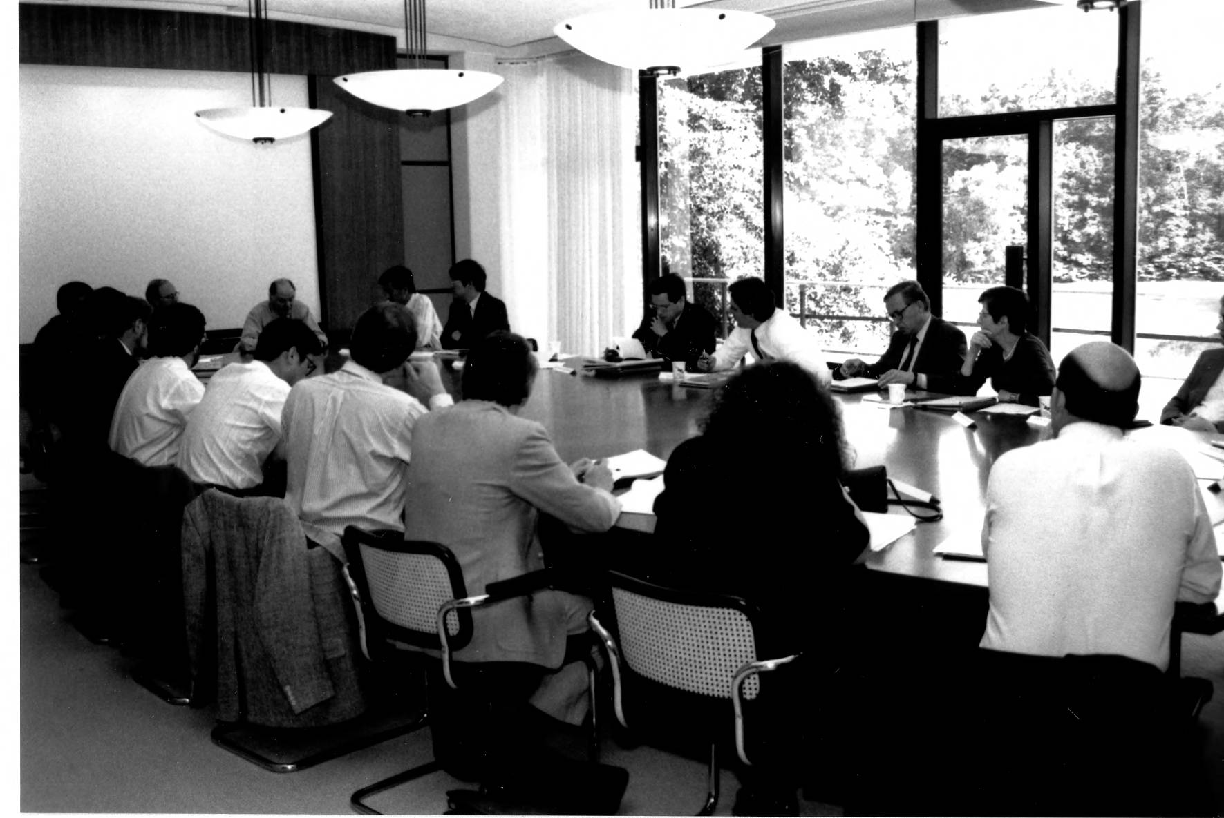 In the White-Levy Room on the Institute for Advanced Study campus, one of the sessions of the June 9-10, 1994, seminar entitled "Force in History." The seminar, supported by the School of Historical Studies (SHS), was chaired and moderated by SHS Faculty member Peter Paret, who is at the head of the table on the right.