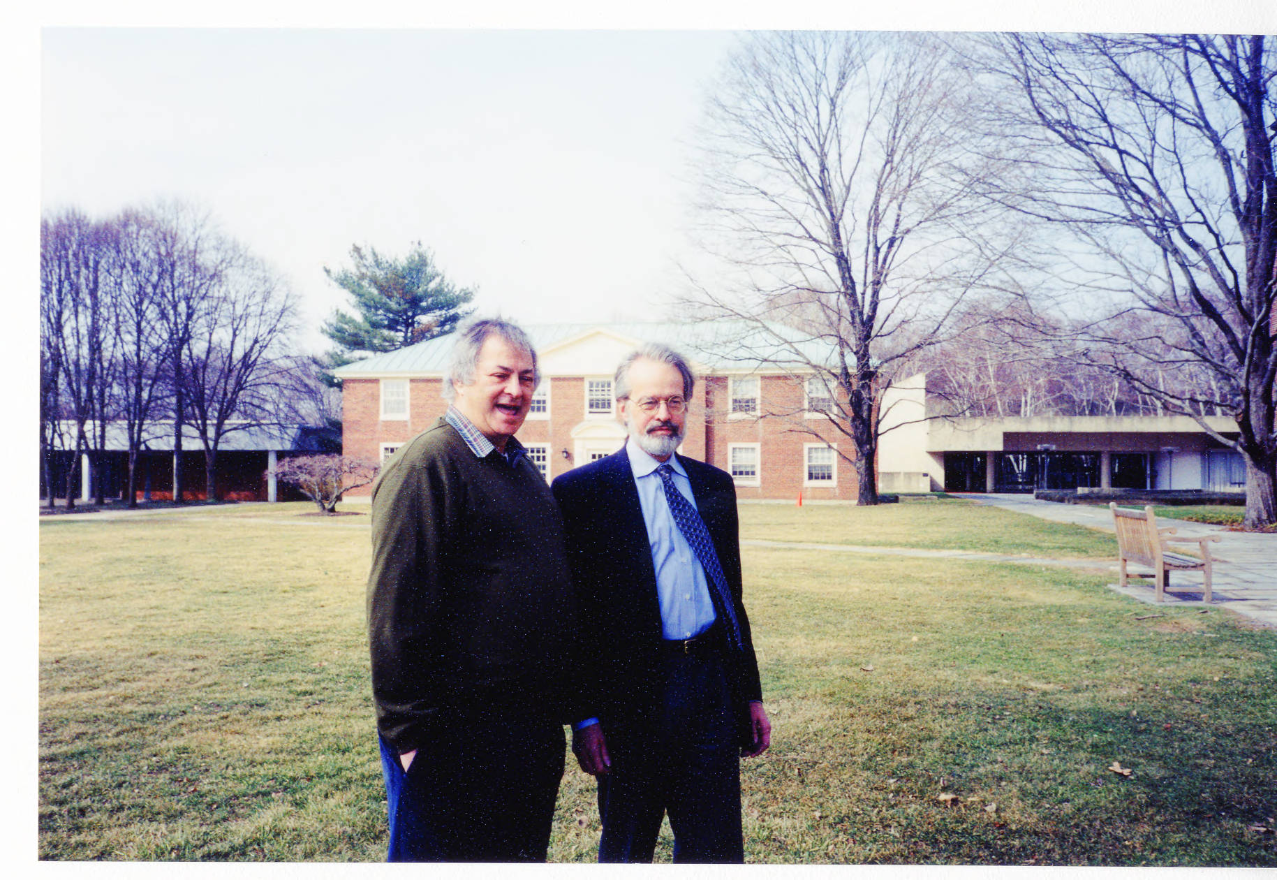 AMIAS (Association of Members of the Institute for Advanced Study) sponsored four public lectures on April 4 & 5, 2003, that were presented at the Institute. Arnold Levine (l.), visiting professor and Member of the School of Natural Sciences, and School of Historical Studies Faculty member Heinrich von Staden are two of the presenters, and are seen here standing on the green at the center of the academic buildings on the Institute campus. Levine was later appointed to the Faculty and established what was named in 2005 The Simons Center for Systems Biology.