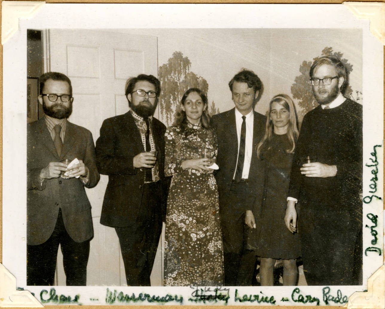 Attending a social gathering of the School of Mathematics at the home of Louise and Marston Morse are (l. to r.): Stephen U. Chase, Arthur G. Wasserman, Judy Levine (according to Louise Morse), Cary B. and Ann Rader, and David I. Gieseker.