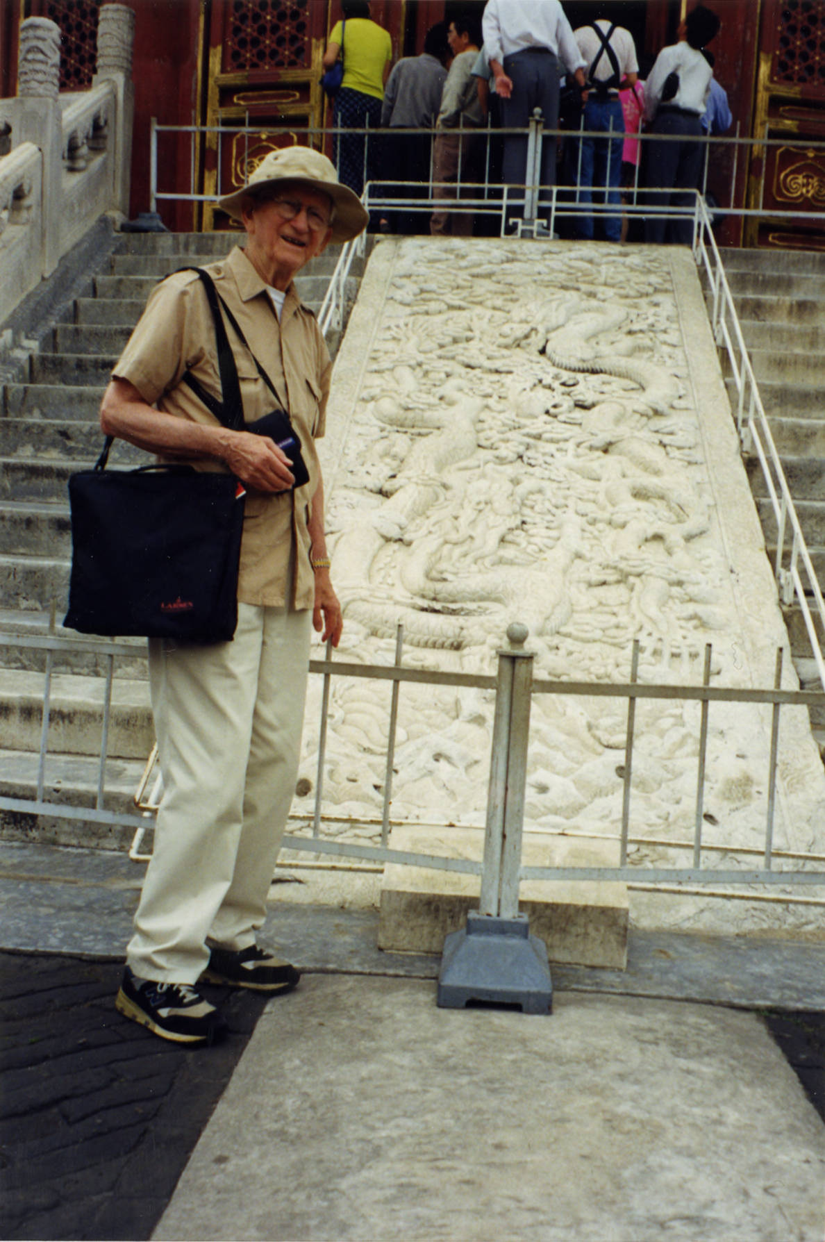 Atle Selberg standing next to a dragon relief sculpture, which is most likely located in the Forbidden City in Beijing, China. One of a series of images taken during a 1998 trip by Selberg to China.