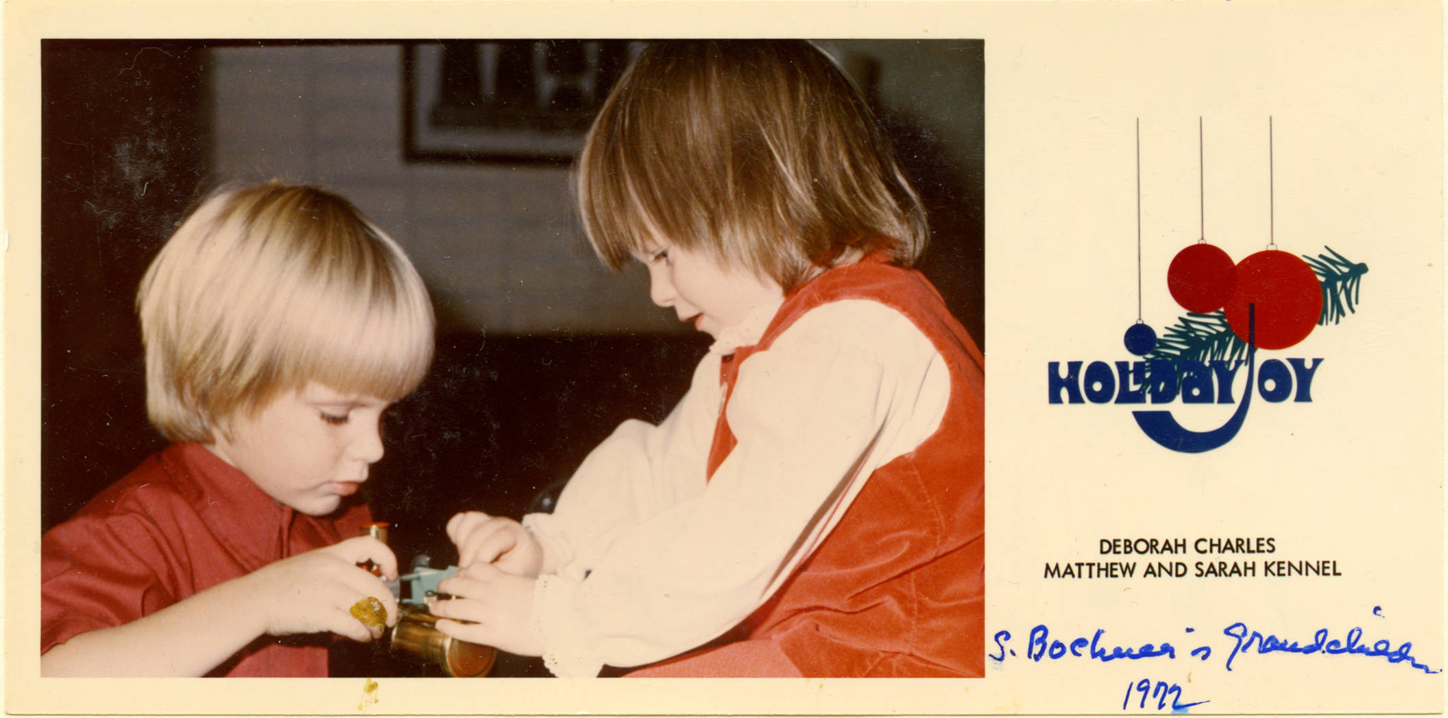 Holiday card from Salomon Bochner's daughter and son-in-law, Deborah and Charles Kennel, featuring a photo of Bochner's grandchildren, Matthew and Sarah.