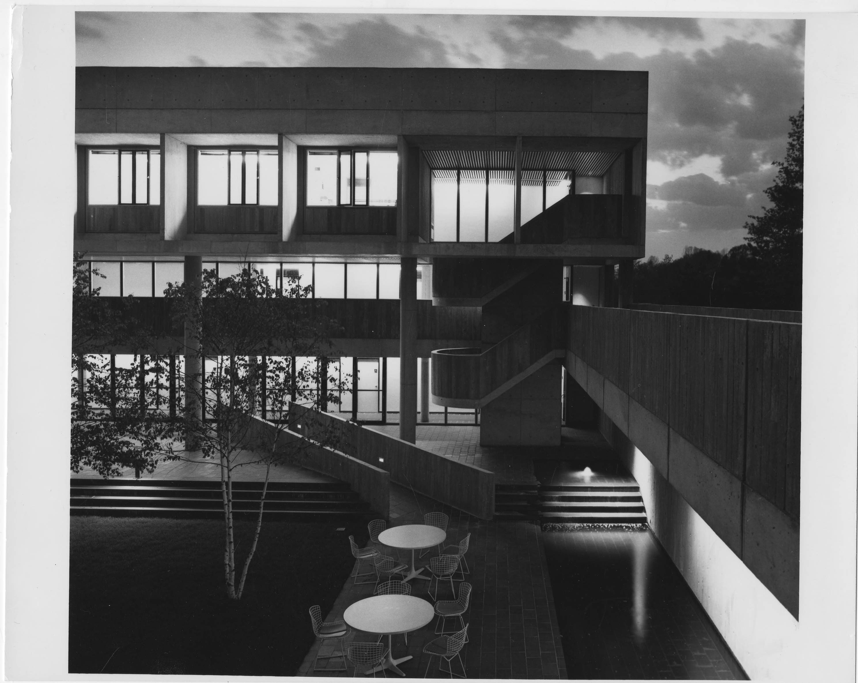 Patio next to Dining Hall at night.