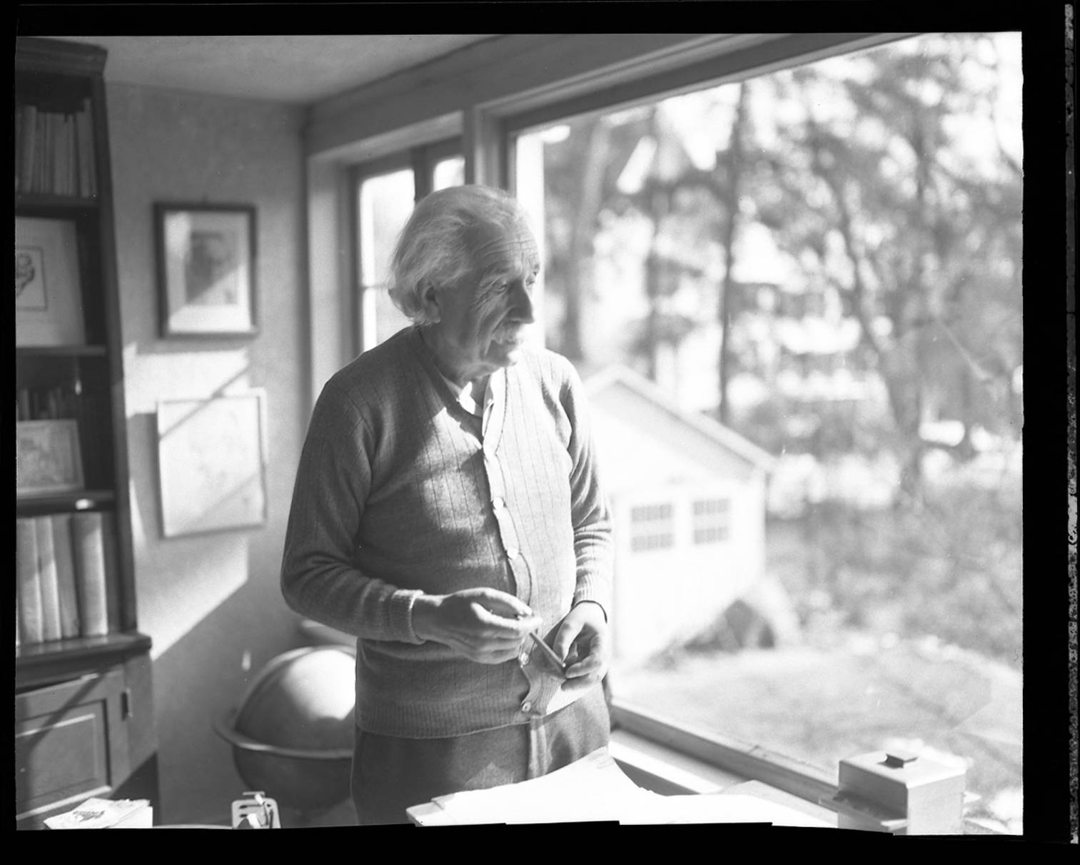 Albert Einstein standing in his home study at 112 Mercer Street, Princeton, New Jersey.