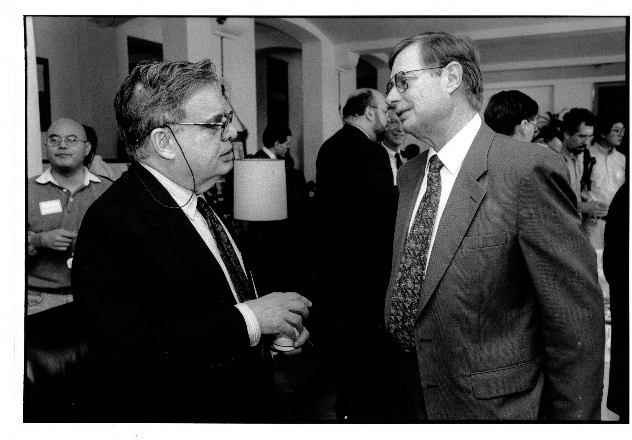 Institute Trustee Leon Levy (l.) and Institute Director Phillip Griffiths at a break in the Fuld Hall Common Room during the "Mathematics and Finance" conference.