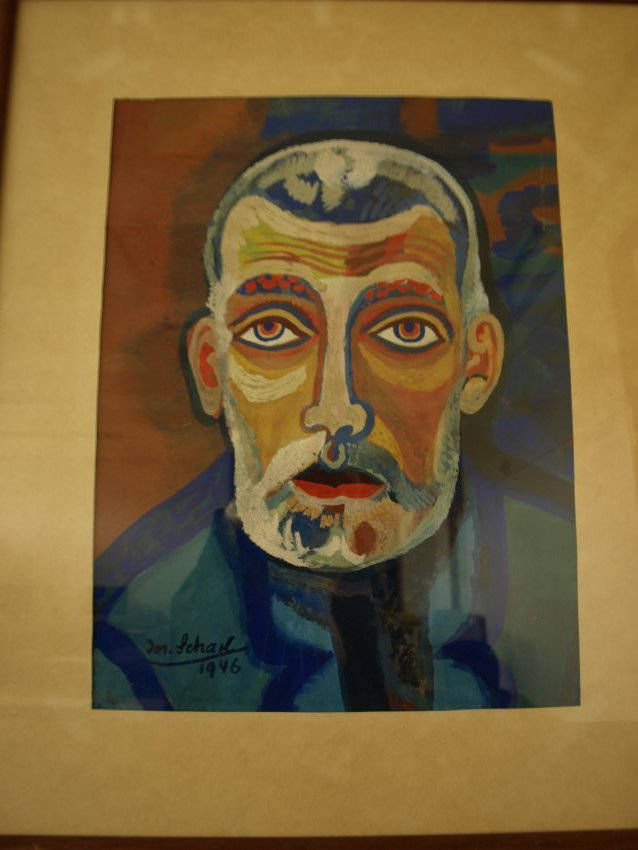 Watercolor of a road with trees, houses, and in left foreground a scrap yard; the houses are in the background and near the scrapyard is a cow, chickens; the road leads to a gas station with a red gas pump; several labels on back "Butler Art Institute, Youngstown Ohio, 1943 New Year Show"."Victory Scrap on Ely's Corner, 342 Nassau Street, Princeton, NJ, price $75.00. white label with #55; "Hayes Storage .13"; on the front lower left glass is a label "103".