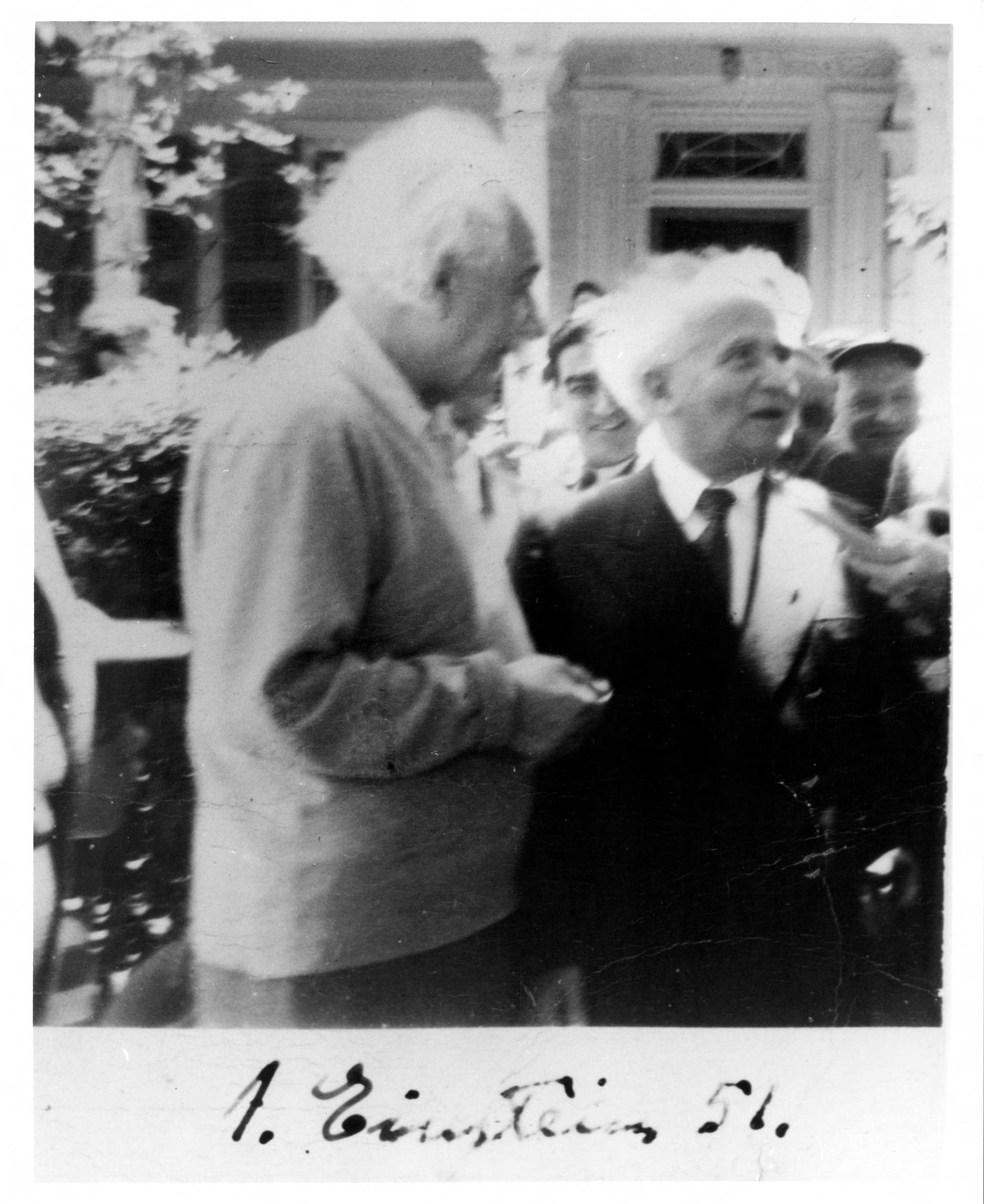 Albert Einstein, David Ben-Gurion and unidentified others outside of Einstein's home at 112 Mercer Street, Princeton, New Jersey.