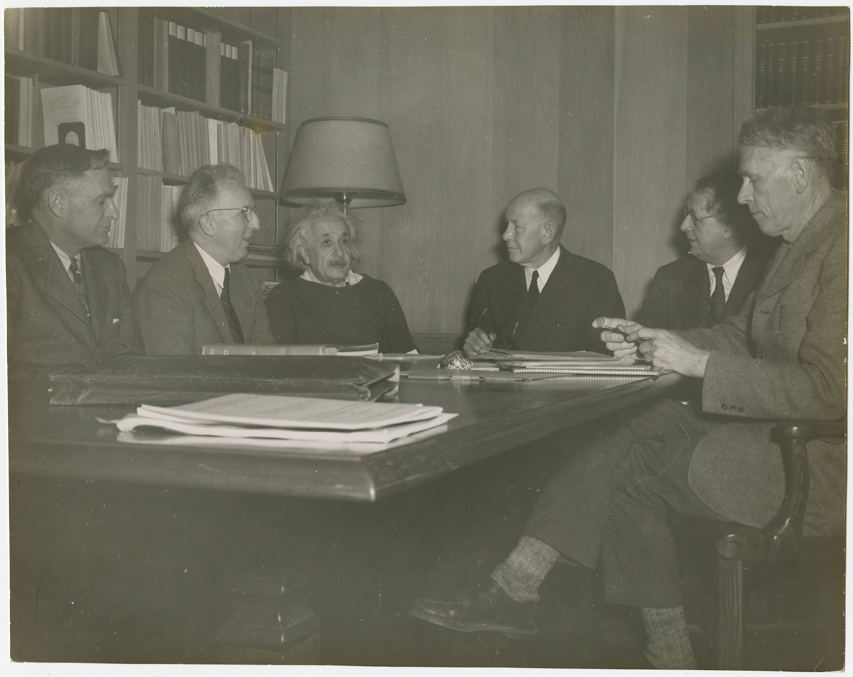 From left to right, James Alexander, Marston Morse, Albert Einstein, Frank Aydelotte, Hermann Weyl, and Oswald Veblen meeting in Fuld Hall on the campus of the Institute for Advanced Study in Princeton, New Jersey. Frank Aydelotte was the Director of the Institute for Advanced Study. The remaining people pictured were on the Faculty of the Institute's School of Mathematics.