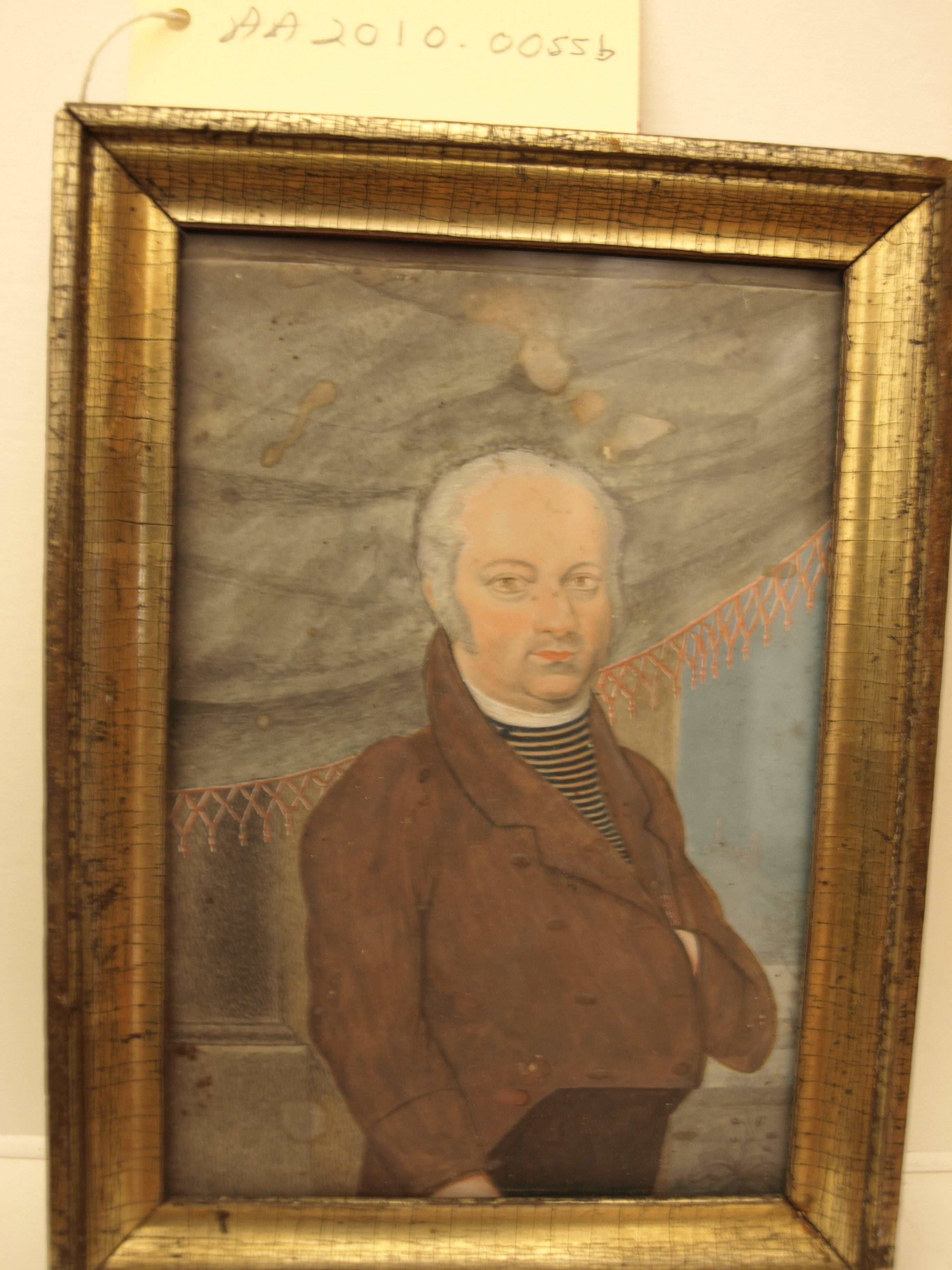 One of a pair of watercolor or tempera portraits of a man and woman; man with gray hair and sideburns is standing slightly turned to his left and looking out at the viewer; he wears a brown jacket and striped shirt and has his left hand inside the front of his jacket; he is standing in front of a fringed drapery and open window; inscription on reverse begins: "Nikolaus v. Dvorni Rovich Lysteruvia...13th September 1820. written above inscription is "h2"; red tag attached :#17 one of pair".(Prof. Habicht of IAS translated: "Nikolaus v. Dvornikovic Sy...vir died at Pest( on the 13th September 1820 buried in the vault of the innercity Church just there Great-grandfather of Alexander v. K...sko" additional info: Vladimir DVORNIKOVIC, Philosopher (1888-1956), Family from Primorje-Gorski Katar county Serbia, Croatia, Slovenia; REVAY noble Hungarian family, Turiec region (Turoc county), in today's Slovakia. Barons, since 1723 Counts. Today's family members live in Trnova, Bratisl