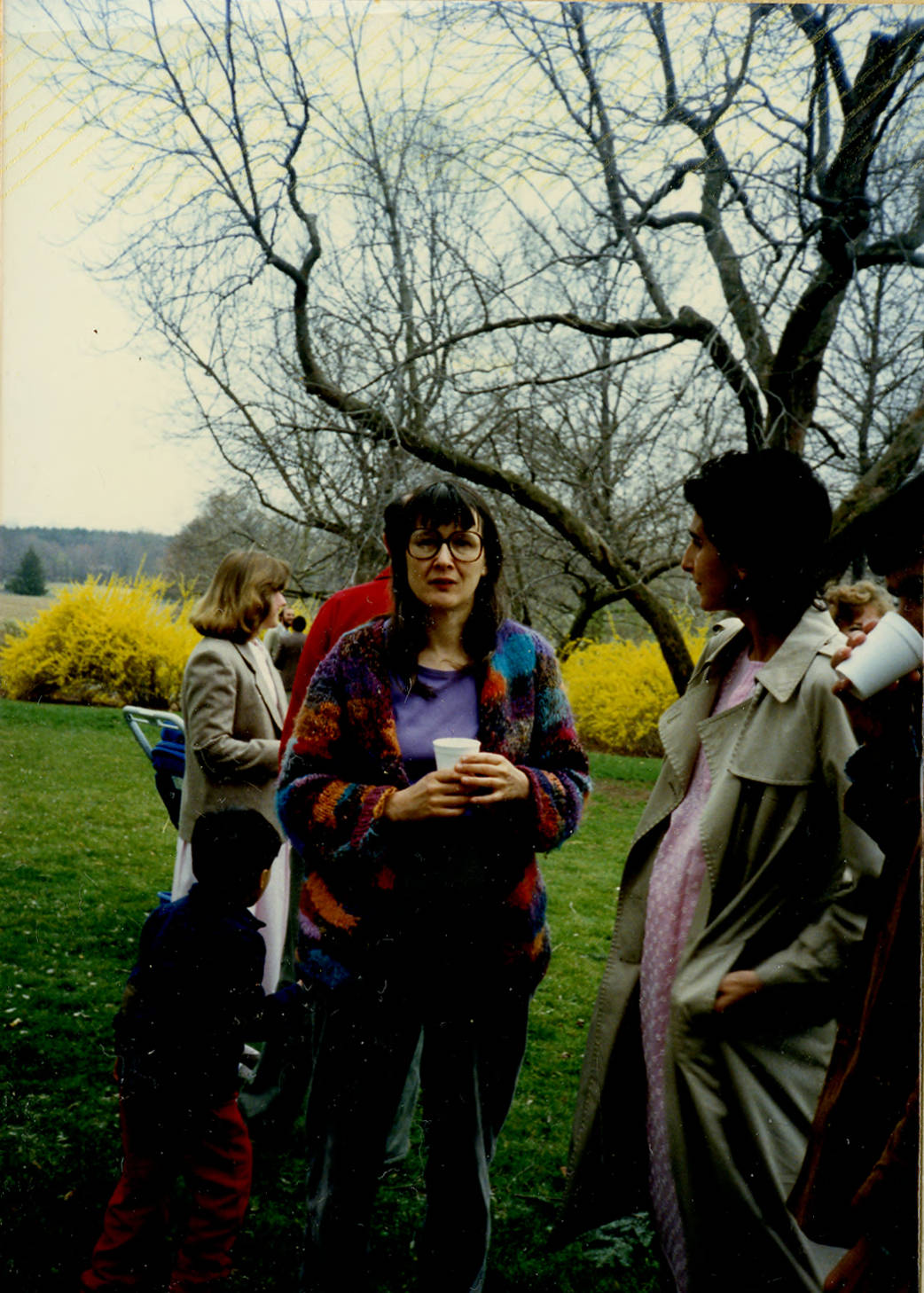 Dusa McDuff (center) with Premala (Premi) Chandra (daughter of Lily and Harish-Chandra) to her right, and other unidentifieds, gather on the grounds of Olden Farm (residence of the Institute for Advanced Study's Director) for the annual Easter egg hunt organized for children in the Institute community.