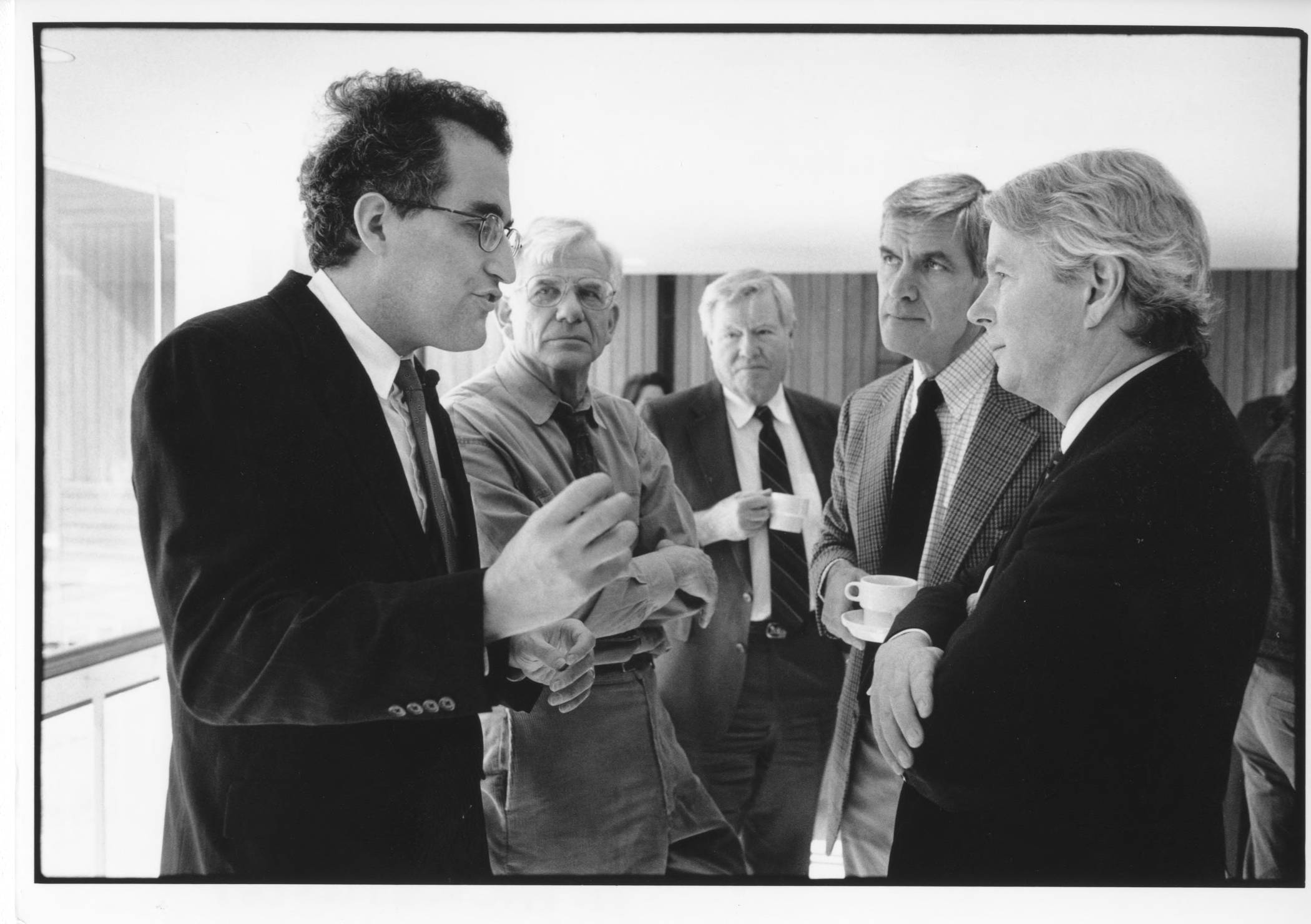Engaged in conversation outside the White-Levy Room on the Institute campus where he was making a presentation are School of Natural Sciences Faculty member Edward Witten (l.) and unidentified individuals attending the talk.